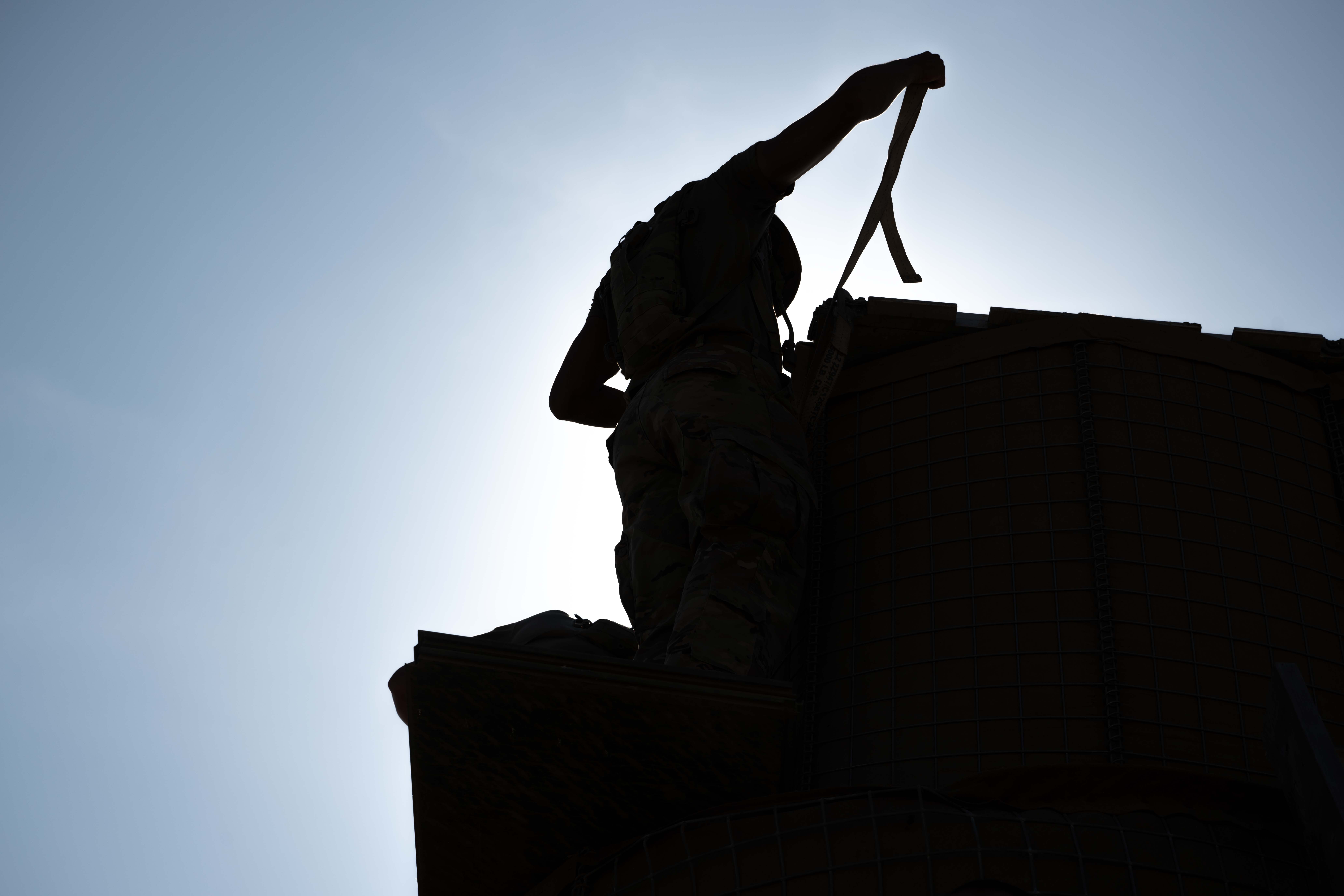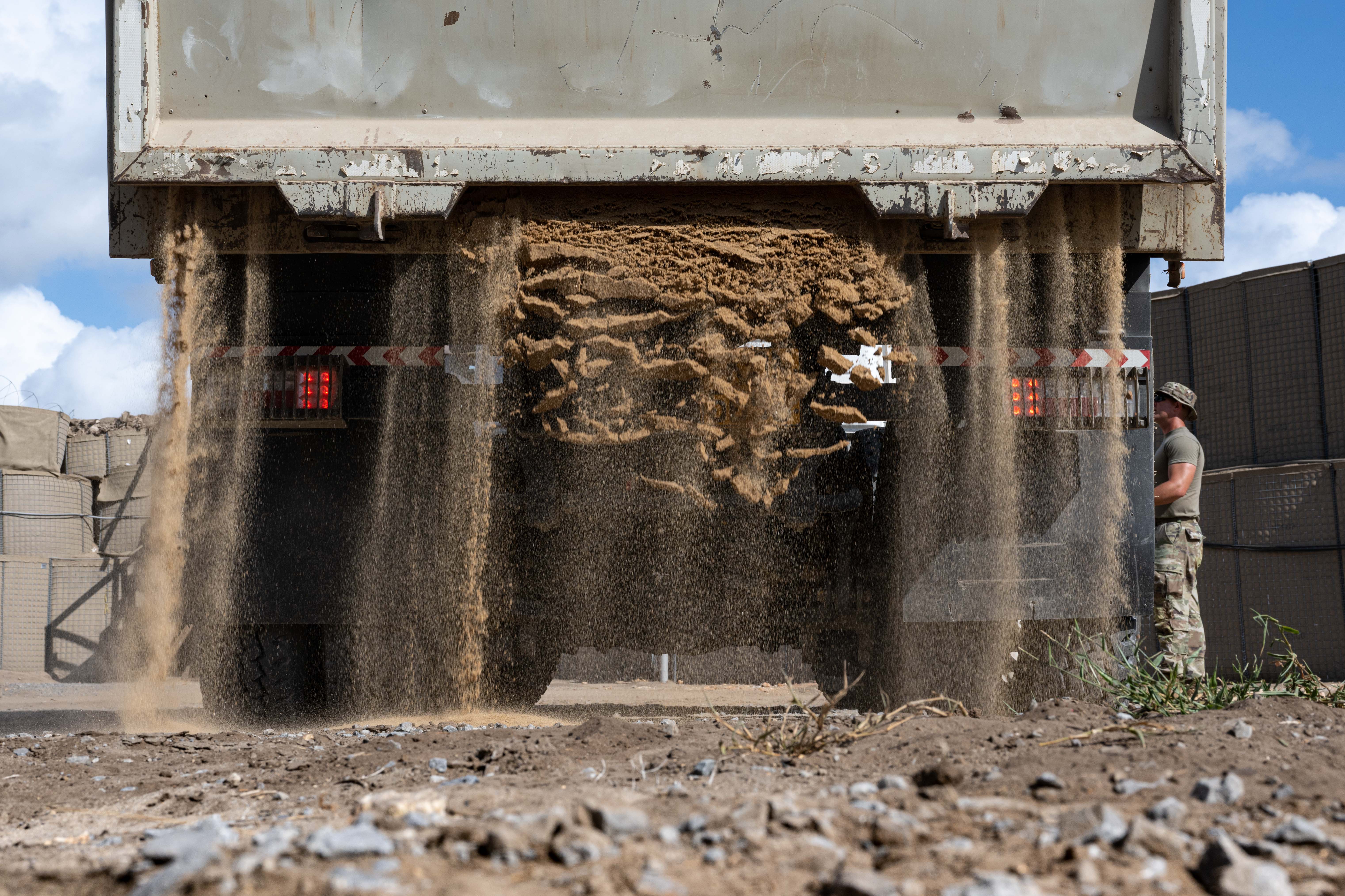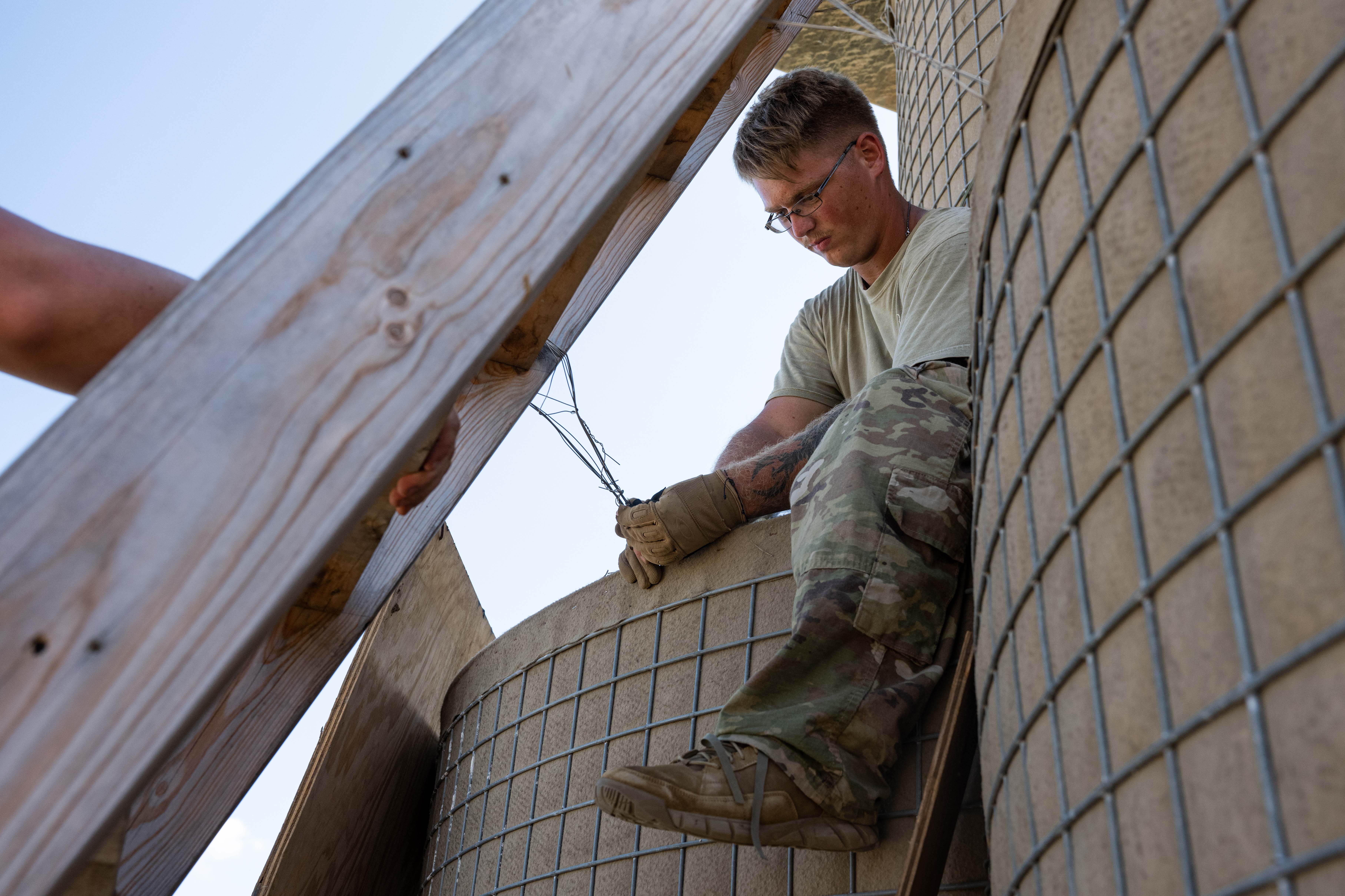 A U.S. service member in 152nd Engineer Support Company, assigned to Combined Joint Task Force - Horn of Africa, improves base infrastructure at Manda Bay, Kenya, March 26, 2025. The mission of the 152 ESC is to enhance regional stability and strengthen relationships with partner nations through various construction projects coordinated across East Africa. (U.S. Air Force photo by Airman 1st Class Joseph Bartoszek)