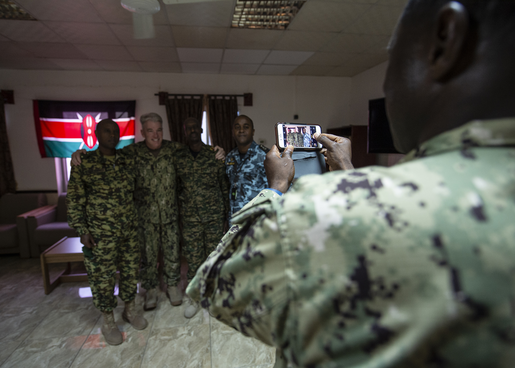 Attendees gather for a group photo at a cultural exchange event led by Kenya Defence Force Lt. Col. Victor Mburu, a foreign liaison officer assigned to Combined Joint Task Force-Horn of Africa (CJTF-HOA), at Camp Lemonnier, Djibouti, March 27, 2019. CJTF-HOA holds monthly exchange events with multinational military partners affiliated with Camp Lemonnier to strengthen alliances and attract new partners in the combined joint military environment. (U.S. Air Force photo by Tech. Sgt. Shawn Nickel)
