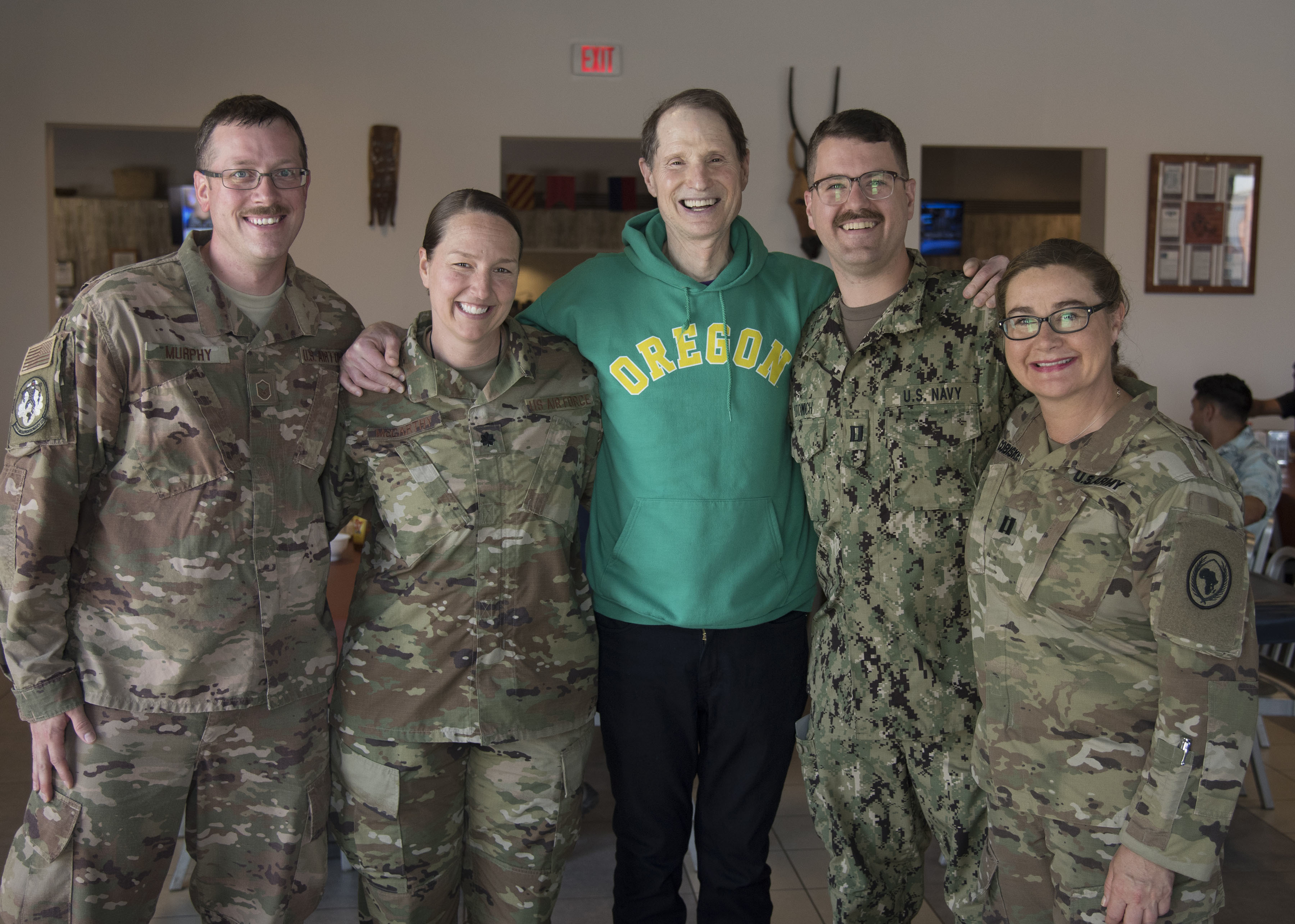 U.S. Sen. Ron Wyden (D-OR) poses for a photo with service members from Oregon deployed to Combined Joint Task Force-Horn of Africa (CJTF-HOA), Djibouti, April 26, 2019. Wyden traveled to Djibouti to visit U.S. forces and embassy officials and to meet with national defense leaders to understand the current posture of readiness and security. (U.S. Air Force photo by Senior Airman Kirsten Brandes)
