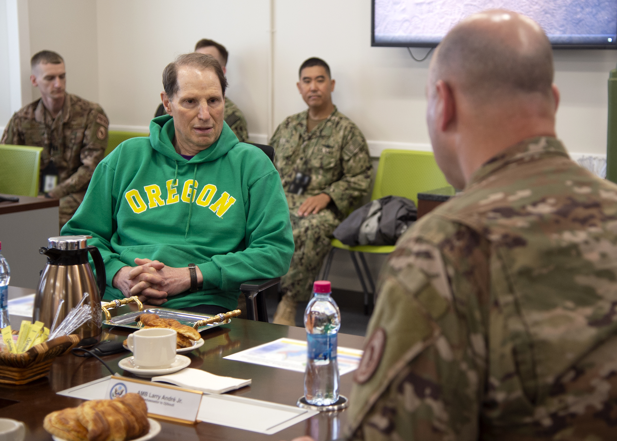 U.S. Sen. Ron Wyden (D-OR) meets with service members from Oregon deployed to Combined Joint Task Force-Horn of Africa (CJTF-HOA), Djibouti, April 26, 2019. Wyden traveled to Djibouti to visit U.S. forces and embassy officials and to meet with national defense leaders to understand the current posture of readiness and security. (U.S. Air Force photo by Senior Airman Kirsten Brandes)