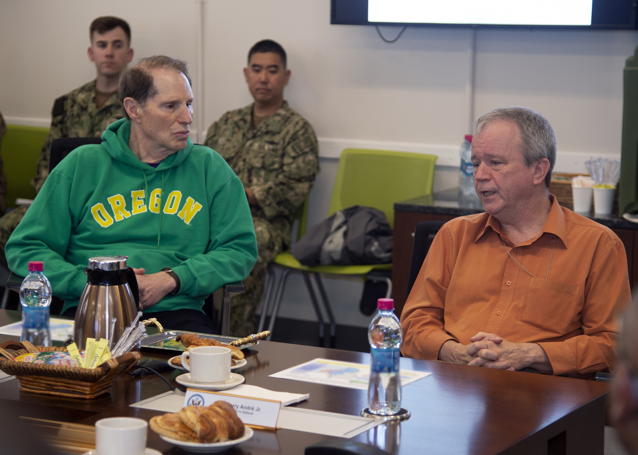 U.S. Sen. Ron Wyden, left, (D-OR) speaks with U.S. Ambassador to Djibouti Larry André, right, during a briefing at Combined Joint Task Force-Horn of Africa, Camp Lemonnier, Djibouti, April 26, 2019. Wyden traveled to Djibouti to visit U.S. forces and embassy officials and to meet with national defense leaders to understand the current posture of readiness and security. (U.S. Navy photo by Mass Communication Specialist 1st Class Nick Scott)