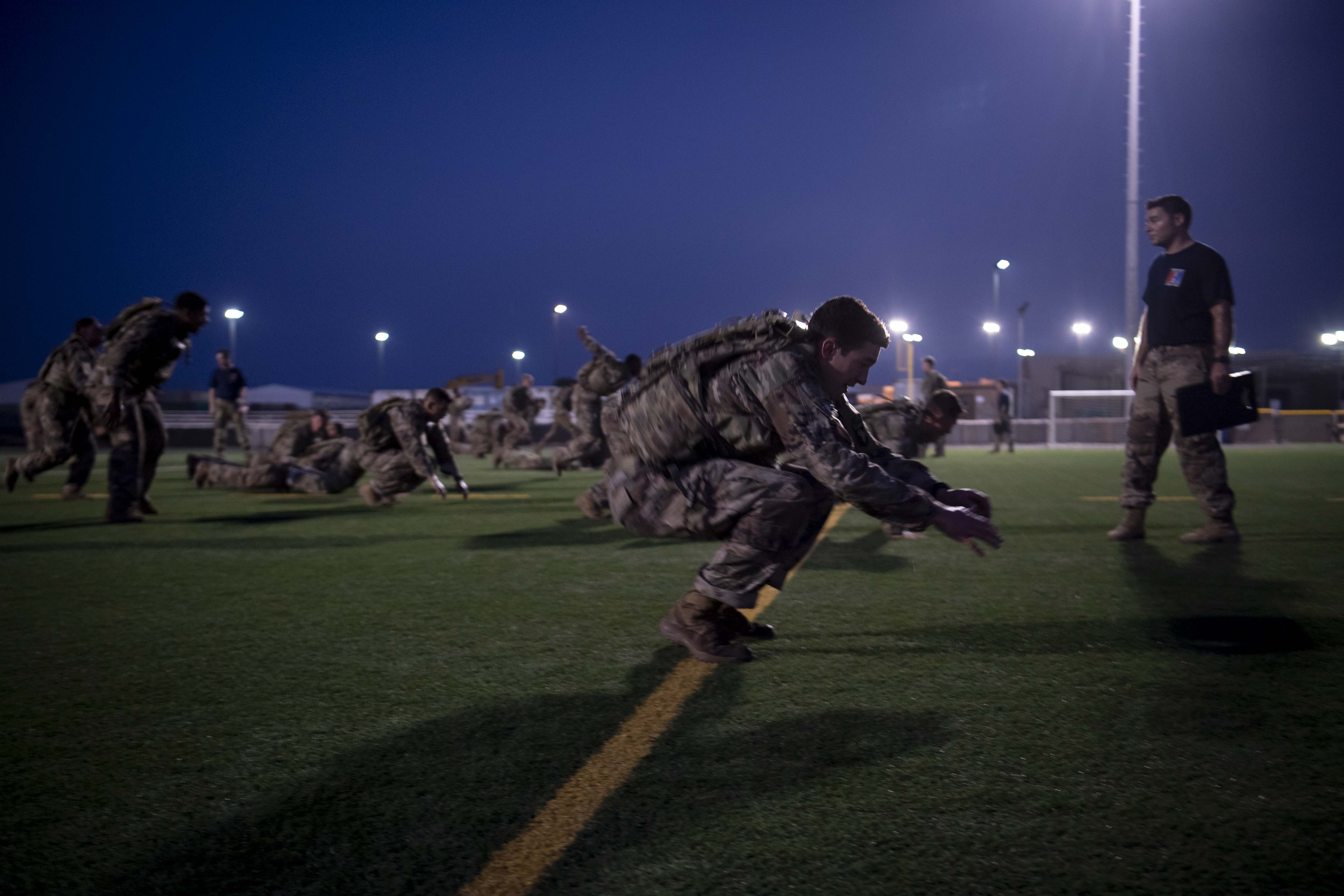 A U.S. Army Soldier from the 101st Division, 2nd Battalion, 506th Infantry Regiment, East African Response Force (EARF), completes a burpee long jump during the EARF’s best platoon competition at Camp Lemonnier, Djibouti, Oct. 25, 2019. During the competition Soldiers completed a two-mile run, 25 meters of lunges, burpee long jumps and high crawls before finishing with 10 eight-count push-ups. (U.S. Air Force photo by Staff Sgt. J.D. Strong II)