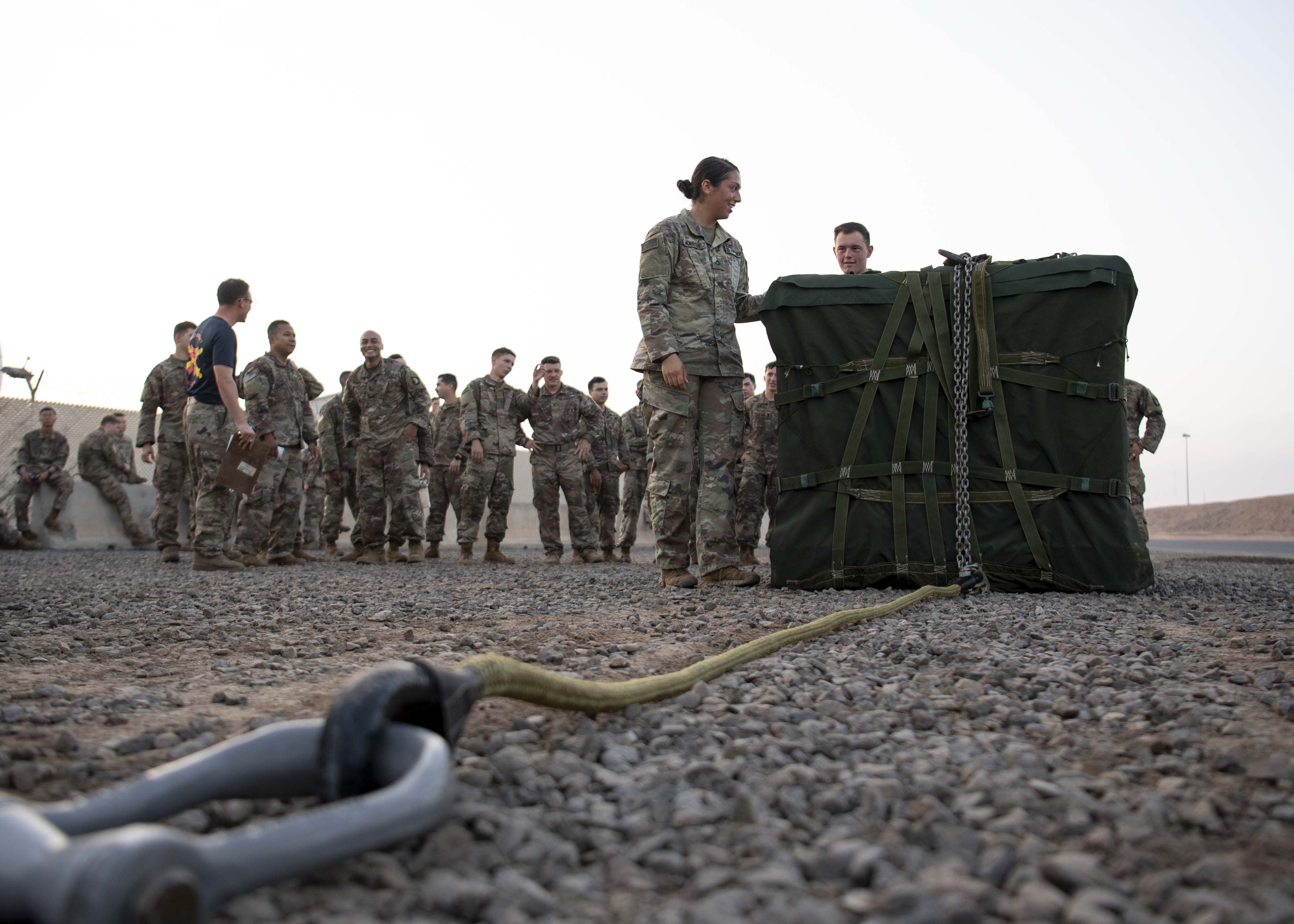 A U.S. Army Soldier from the 101st Division, 2nd Battalion, 506th Infantry Regiment, East African Response Force (EARF), inspects cargo for discrepancies during the EARF’s best platoon competition at Camp Lemonnier, Djibouti, Oct. 25, 2019. During the competition Soldiers completed a two-mile run, 25 meters of lunges, burpee long jumps and high crawls before finishing with 10 eight-count push-ups. (U.S. Air Force photo by Staff Sgt. J.D. Strong II)