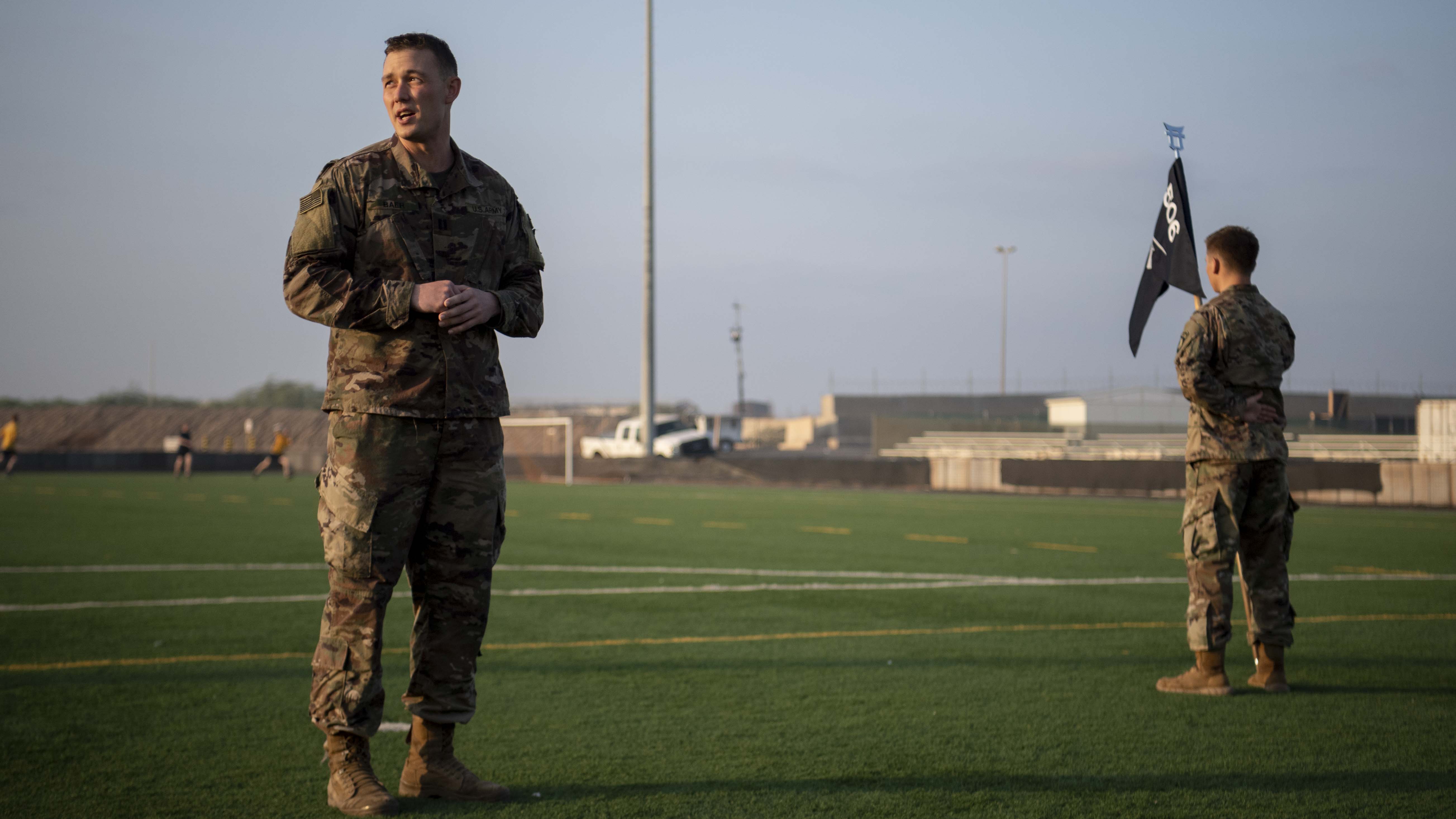 U.S. Army Capt. Christopher Baer, company commander, 101st Division, 2nd Battalion, 506th Infantry Regiment, East African Response Force (EARF), assigned to Combined Joint Task Force-Horn of Africa, speaks to his company during a patching ceremony at Camp Lemonnier, Djibouti, Oct. 25, 2019. Army combat patches signify a Soldier’s service in a combat zone and represent service in a member’s current, or prior, unit. (U.S. Air Force photo by Staff Sgt. J.D. Strong II)