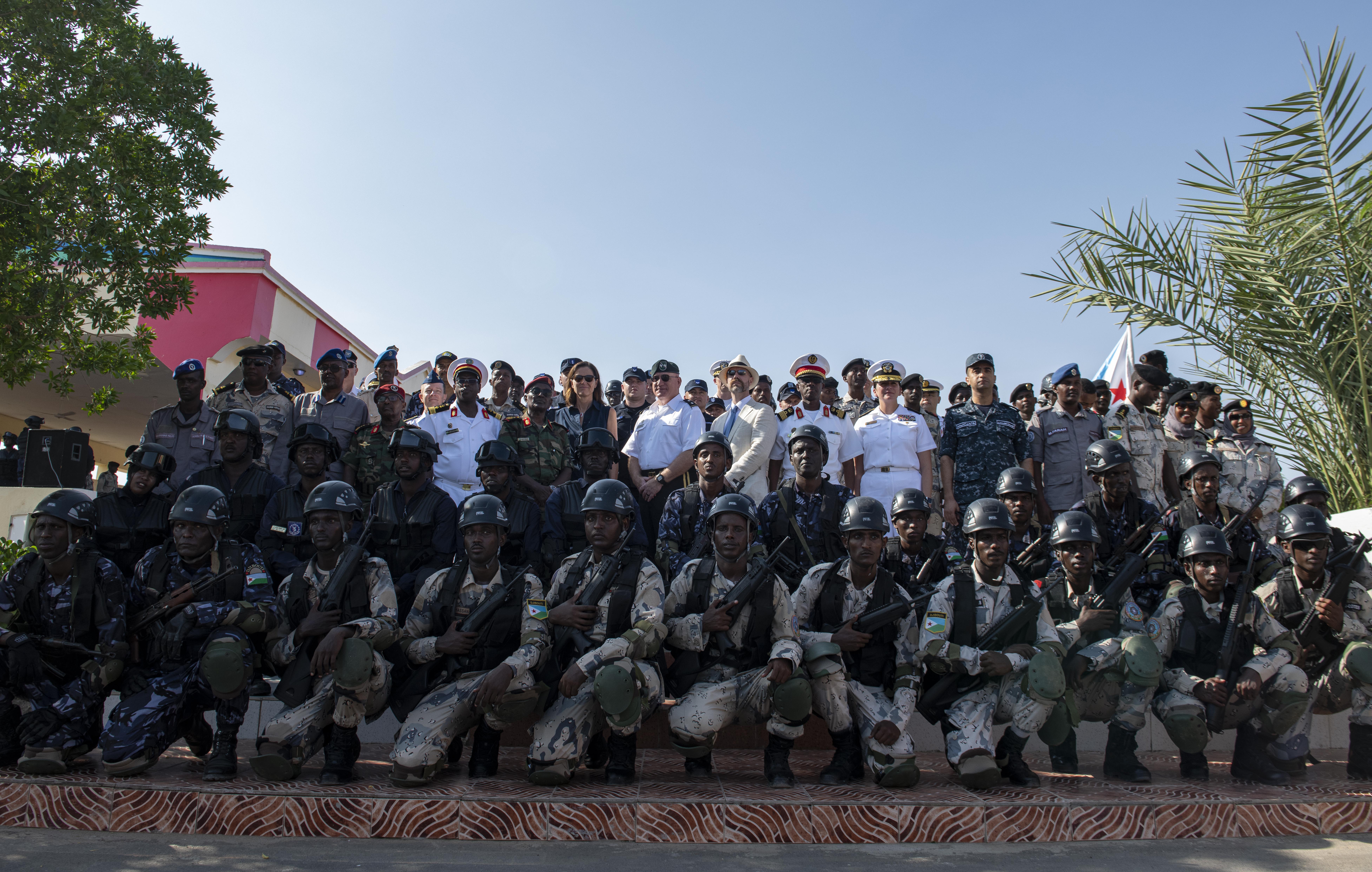 Local and international military leaders and government officials gather for a group photo after the opening ceremony of the multinational maritime exercise Cutlass Express 2019.2 (CE 19.2) held at the Doraleh Coast Guard Training Center in Djibouti, Oct. 28, 2019. CE 19.2, sponsored by U.S. Africa Command and led by U.S. Naval Forces Europe-Africa/U.S. 6th Fleet (CNE-CNA/C6F), intends to assess and improve combined maritime law enforcement capacity, promote national and regional security in East Africa, and increase interoperability among the U.S., African nations, and international partners. (U.S. Air Force photo by Senior Airman Gabrielle Spalding)