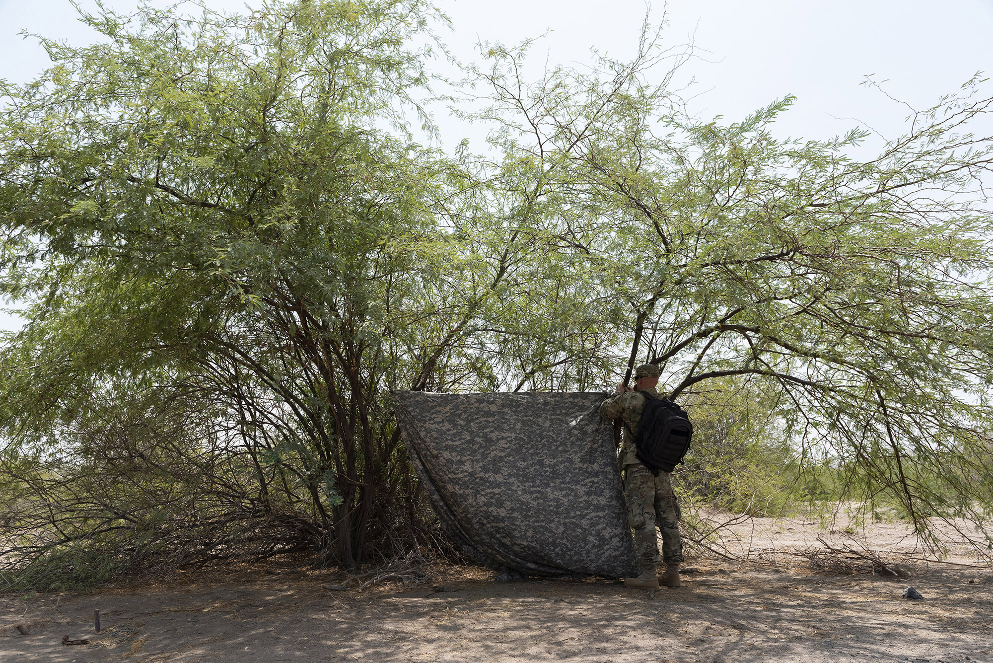 From Left: U.S. Air Force Tech. Sgt. Adam Murphy, a survival, evasion, resistance and escape specialist assigned to Combined Joint Task Force-Horn of Africa, teaches U.S. Army Pfc. Jonathan Galindo, a field artillery firefinder radar operator, Sgt. 1st Class Amando Vidal, a field artillery firefinder radar operator, and Spec. Killian Tooke, a radar repairer, all assigned to 3rd Battalion, 133rd Field Artillery Regiment, Texas National Guard, how to create a slipknot, bowline and a trucker’s hitch during survival skills training on Camp Lemonnier, Djibouti, Oct. 13, 2018. During this training, service members performed various skills such as constructing a shelter, finding alternative water sources and signaling for rescue. (U.S. Air National Guard photo by Master Sgt. Sarah Mattison)