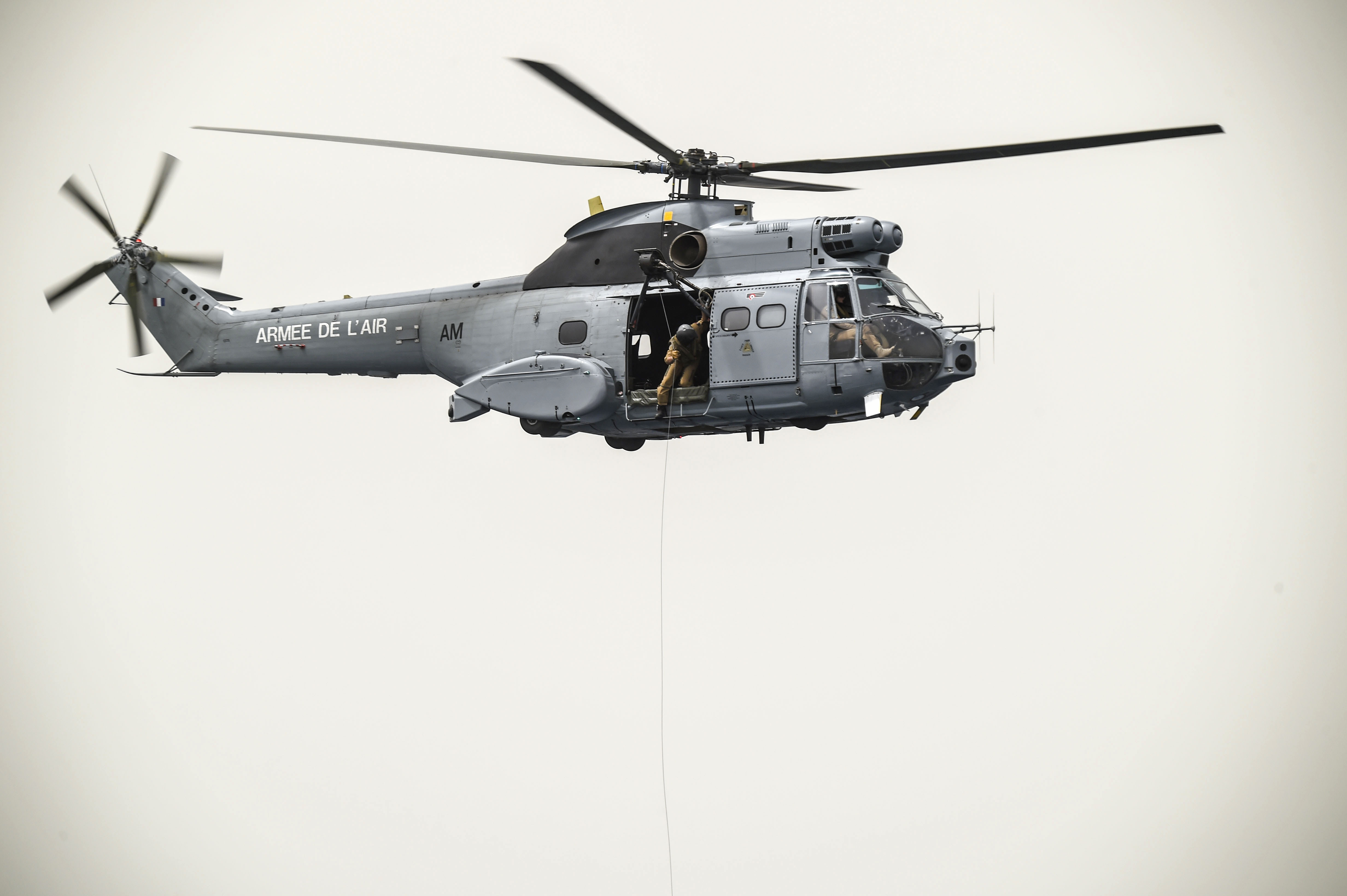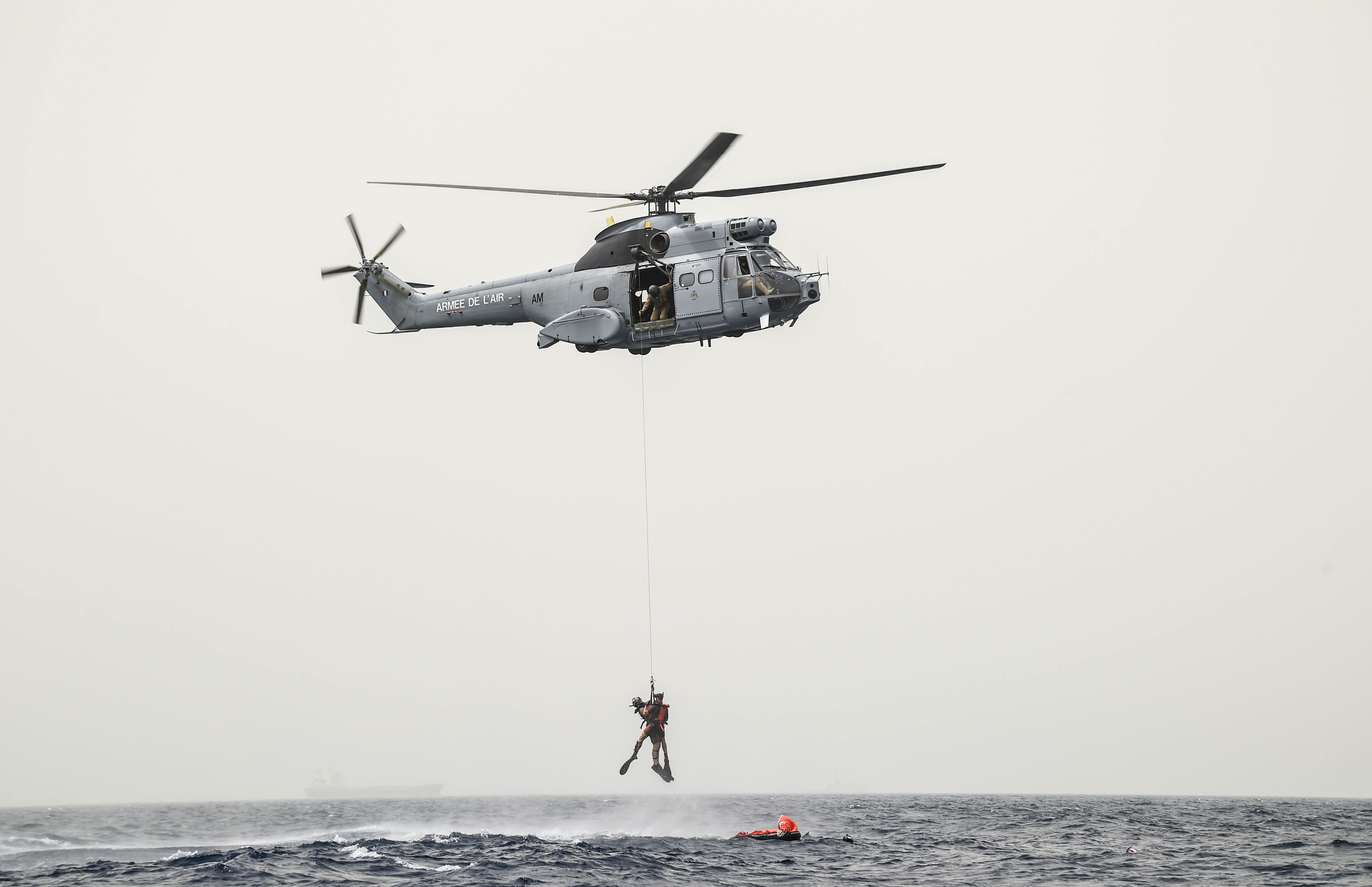 A French Air Force Aérospatiale SA 330 Puma helicopter hovers over the Gulf of Tadjoura during a bilateral water operations exercise pararescuemen from the 82nd Expeditionary Rescue Squadron, assigned to Combined Joint Task Force-Horn of Africa, in the Gulf of Tadjoura, July 3, 2017. The results of the exercise will aid in the development of standard operating procedures between CJTF-HOA and the French Forces stationed in Djibouti for the U.S. and France’s mutual support of maritime rescue capabilities within the Horn of Africa region. (U.S. Air Force photo by Staff Sgt. Eboni Prince)