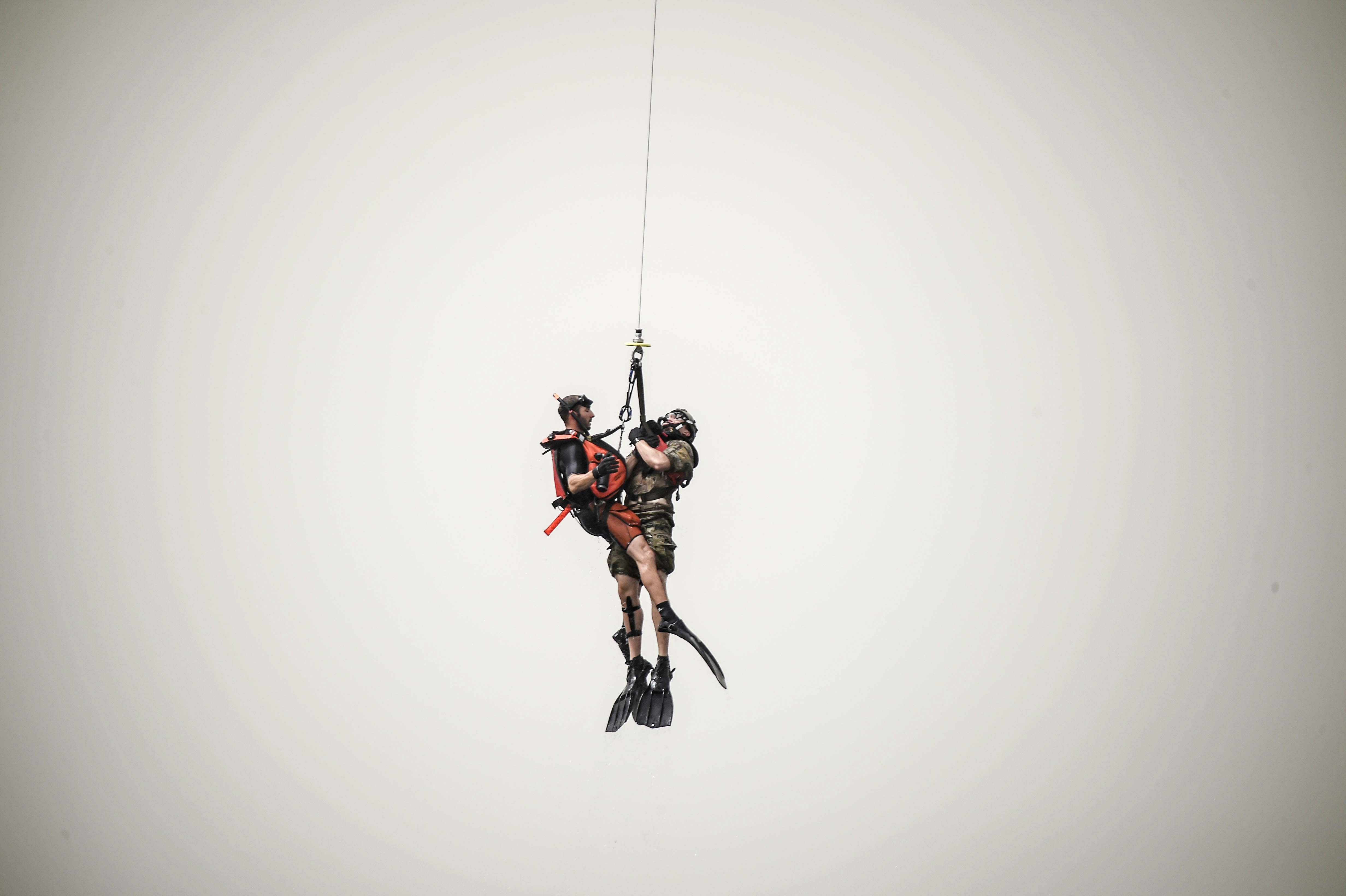 A French Air Force member assigned to the Transport Squadron ET 88 and a U.S. Air Force pararescueman from the 82nd Expeditionary Rescue Squadron, assigned to Combined Joint Task Force-Horn of Africa, are hoisted by a cable to a French Air Force Aérospatiale SA 330 Puma helicopter during a bilateral water operations exercise, in the Gulf of Tadjoura, July 3, 2017. The results of the exercise will aid in the development of standard operating procedures between CJTF-HOA and the French Forces stationed in Djibouti for the U.S. and France’s mutual support of maritime rescue capabilities within the Horn of Africa region. (U.S. Air Force photo by Staff Sgt. Eboni Prince)