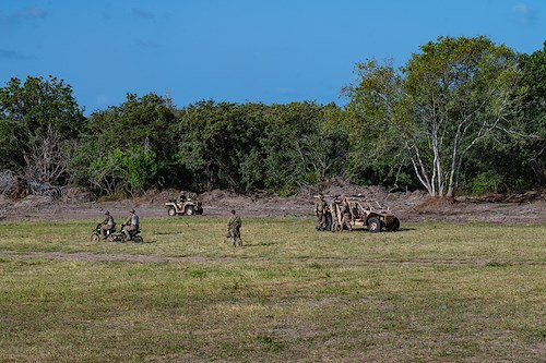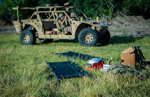 Medical equipment lay on a field for joint training exercises with U.S. Air Force Special Tactics Airmen from the Expeditionary Special Tactics Squadron Africa and medical personnel with the 475th Expeditionary Air Base Squadron (EABS) at Camp Simba, Kenya, Aug. 24, 2021. The 475th EABS medics received tactical vehicle training and practiced life-saving tactical combat casualty care techniques.