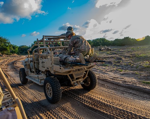 U.S. Army medics with the 475th Expeditionary Air Base Squadron (EABS) test-drive a tactical vehicle during joint training exercises with the U.S. Air Force Special Tactics Airmen from the Expeditionary Special Tactics Squadron Africa at Camp Simba, Kenya, Aug. 24, 2021. The 475th EABS medics received tactical vehicle training and practiced life-saving tactical combat casualty care techniques.