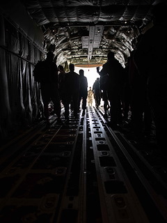 Personnel assigned to Combined Joint Task Force- Horn of Africa (CJTF-HOA) depart from a MV-22 Osprey at Grand Bara, Djibouti, March 9, 2021. The personnel participated in Exercise WAKRI, a low-level airdrop and personnel recovery exercise. (U.S. Air Force photo by Senior Airman Taylor Davis)
