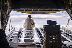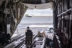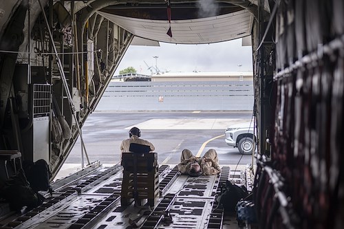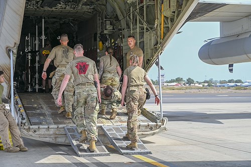 DJIBOUTI- U.S. Army combat medics from Task Force Paxton, 56th Stryker Brigade Combat Team, Pennsylvania National Guard assembled on the tarmac to conduct joint medical evacuation cold-load training aboard a KC-130J aircraft at Camp Lemonnier, Djibouti, March 5, 2024. Medics participated in casualty evacuation operations by working with flight medical personnel and aircraft crew-members in the event that life saving measures and medical evacuation are requested.