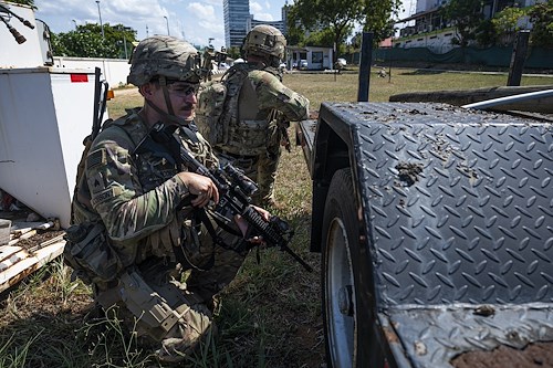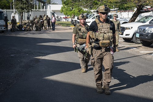 Members of the East Africa Response Force (EARF), assigned to Combined Joint Task Force Ð Horn of Africa (CJTF-HOA), patrol the grounds at the U.S. Embassy in Tanzania in order to practice embassy security augmentation during an Emergency Deployment Readiness Exercise Oct. 10, 2023, at Dar es Salaam, Tanzania. The EARF is a U.S. Army National Guard infantry company tasked with providing rapid security augmentation, humanitarian aid and disaster response assistance, and military-assisted departure of Department of State personnel at U.S. embassies during crises throughout the African continent. (U.S. Air Force photo by Tech. Sgt. Ridge Shan)