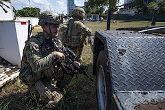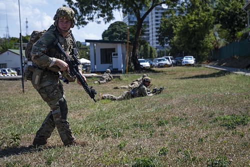 A member of the East Africa Response Force (EARF), assigned to Combined Joint Task Force Ð Horn of Africa (CJTF-HOA), moves into a security position at the U.S. Embassy in Tanzania during an Emergency Deployment Readiness Exercise Oct. 11, 2023, at Dar es Salaam, Tanzania. The EARF is a U.S. Army National Guard infantry company tasked with providing rapid security augmentation, humanitarian aid and disaster response assistance, and military-assisted departure of Department of State personnel at U.S. embassies during crises throughout the African continent. (U.S. Air Force photo by Tech. Sgt. Ridge Shan)
