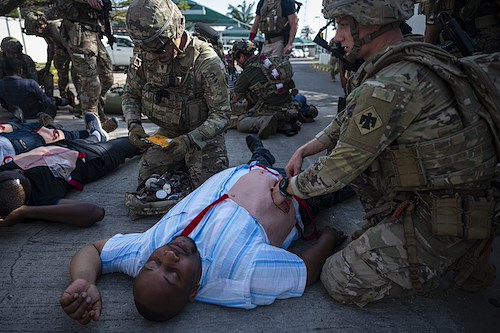 Members of the East Africa Response Force (EARF), assigned to Combined Joint Task Force Ð Horn of Africa (CJTF-HOA), practice emergency tactical first aid medical care on volunteers at the U.S. Embassy in Tanzania during a mass casualty scenario as part of an Emergency Deployment Readiness Exercise Oct. 11, 2023, at Dar es Salaam, Tanzania. The EARF is a U.S. Army National Guard infantry company tasked with providing rapid security augmentation, humanitarian aid and disaster response assistance, and military-assisted departure of Department of State personnel at U.S. embassies during crises throughout the African continent. (U.S. Air Force photo by Tech. Sgt. Ridge Shan)