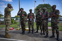 A member of Combined Joint Task Force Ð Horn of Africa (CJTF-HOA), salutes with a member of the Tanzanian PeopleÕs Defense Force after engaging in a knowledge exchange at the U.S. Embassy in Tanzania during an Emergency Deployment Readiness Exercise (EDRE) Oct. 11, 2023, at Dar es Salaam, Tanzania. The EDRE maintains readiness for the East Africa Response Force (EARF), which is a U.S. Army National Guard infantry company tasked with providing rapid security augmentation, humanitarian aid and disaster response assistance, and military-assisted departure of Department of State personnel at U.S. embassies during crises throughout the African continent. (U.S. Air Force photo by Tech. Sgt. Ridge Shan)