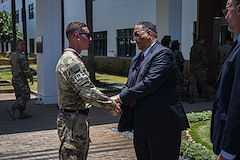 U.S. Army CPT Jacob McDonough, East Africa Response Force (EARF) commander, shakes hands with Dr. Michael A. Battle, Sr., U.S. Ambassador to Tanzania, during an Emergency Deployment Readiness Exercise Oct. 11, 2023, at Dar es Salaam, Tanzania. The EARF, assigned to Combined Joint Task Force Ð Horn of Africa (CJTF-HOA), is a U.S. Army National Guard infantry company tasked with providing rapid security augmentation, humanitarian aid and disaster response assistance, and military-assisted departure of Department of State personnel at U.S. embassies during crises throughout the African continent. (U.S. Air Force photo by Tech. Sgt. Ridge Shan)