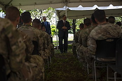 Dr. Michael A. Battle, Sr., U.S. Ambassador to Tanzania, speaks to members of the East Africa Response Force (EARF), assigned to Combined Joint Task Force Ð Horn of Africa (CJTF-HOA), at the U.S. embassy in Tanzania during an Emergency Deployment Readiness Exercise Oct. 11, 2023, at Dar es Salaam, Tanzania. The EARF is a U.S. Army National Guard infantry company tasked with providing rapid security augmentation, humanitarian aid and disaster response assistance, and military-assisted departure of Department of State personnel at U.S. embassies during crises throughout the African continent. (U.S. Air Force photo by Tech. Sgt. Ridge Shan)