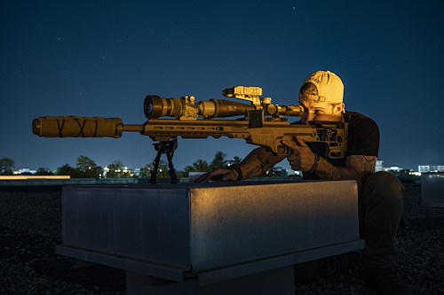 A member of the East Africa Response Force (EARF), in plainclothes in order to blend in with Department of State personnel, mans a security observation position at the U.S. Embassy in Tanzania during an Emergency Deployment Readiness Exercise Oct. 10, 2023, at Dar es Salaam, Tanzania. The EARF, assigned to Combined Joint Task Force Ð Horn of Africa (CJTF-HOA), is a U.S. Army National Guard infantry company tasked with providing rapid security augmentation, humanitarian aid and disaster response assistance, and military-assisted departure of Department of State personnel at U.S. embassies during crises throughout the African continent. (U.S. Air Force photo by Tech. Sgt. Ridge Shan)