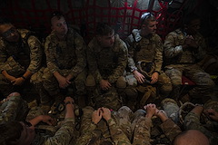 Members of the East Africa Response Force (EARF), assigned to Combined Joint Task Force Ð Horn of Africa (CJTF-HOA), sit aboard a U.S. Air Force C-130 while awaiting transport to the U.S. Embassy in Tanzania in order to practice embassy security augmentation during an Emergency Deployment Readiness Exercise Oct. 10, 2023, at Camp Lemonnier, Djibouti. The EARF is a U.S. Army National Guard infantry company tasked with providing rapid security augmentation, humanitarian aid and disaster response assistance, and military-assisted departure of Department of State personnel at U.S. embassies during crises throughout the African continent. (U.S. Air Force photo by Tech. Sgt. Ridge Shan)