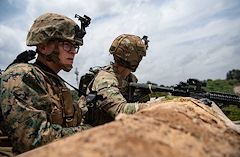 Soldiers with French Forces in Djibouti (FFDJ) scan the area of operations during Exercise WAKRI 22 at Arta Range, March 13, 2022. Exercise WAKRI 22, the largest annual French-led exercise on the African continent, was spread out across Djibouti and provided realistic training for French Armed Forces air, ground and sea components alongside their U.S. Allies. The three-day exercise demonstrated how the U.S. and France train together to defend against threats, strengthening their collective security forces and promoting regional security, stability, and prosperity. (U.S. Air Force photo by Senior Airman Blake Wiles)