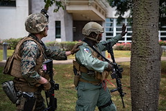 A U.S. Marine with the Marine Security Augmentation Unit (MSAU) based out of the U.S. Embassy Nairobi, Kenya and a Kenyan Defense Force member with the Special Program for Embassy Augmentation and Response (SPEAR), prepare to subdue simulated threats during an Emergency Deployment Readiness Exercise (EDRE) in Nairobi, Kenya, February 25, 2022. SPEAR teams regularly participate in multinational joint readiness and training exercises with U.S. Marine Security Guards, embassy bodyguards, and embassy local guard forces. (U.S. Air Force photo by Staff Sgt. Joel Pfiester)