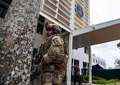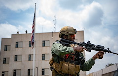 A Kenyan Defense Force member with the Special Program for Embassy Augmentation and Response (SPEAR) pulls security during an Emergency Deployment Readiness Exercise (EDRE) in Nairobi, Kenya, February 25, 2022. SPEAR enhances the security of U.S. diplomatic posts in high-threat, high-risk environments by training law enforcement and security personnel in host nations to better respond to emergencies at U.S. diplomatic facilities. The EDREs ensure the Combined Joint Task Force - Horn of Africa (CJTF-HOA) is prepared for any contingency, including crisis response, humanitarian assistance, non-combatant evacuation operations, disaster relief operations, support to U.S. embassies, recovery capabilities of aircraft and personnel, and other missions as directed. (U.S. Air Force photo by Staff Sgt. Joel Pfiester)