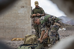 French service members with the 5th Overseas Interarms Regiment (5e RIAOM) practice casualty evacuation techniques at the French Combat Training Center at Arta Beach, Djibouti, Dec. 14, 2021. Five instructors from the U.S. Army Mountain Warfare School in Jericho, Vt. taught a five-day Joint Expeditionary Mountain Warfare Course on basic military mountaineering skills to French service members in Djibouti to strengthen the relationships among the international forces working together in the region.