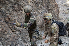 U.S. Army Staff Sgt. Elijah Amendola, 1-102nd Infantry Regiment (Mountain), Task Force Iron Gray, Combined Joint Task Force – Horn of Africa (CJTF-HOA), assists a French service member with the 5th Overseas Interarms Regiment (5e RIAOM) on fixed rope techniques at the Arta Range Complex, Djibouti, Dec. 15, 2021. Five instructors from the U.S. Army Mountain Warfare School in Jericho, Vt. taught a five-day Joint Expeditionary Mountain Warfare Course on basic military mountaineering skills to French service members in Djibouti to strengthen the relationships among the international forces working together in the region.