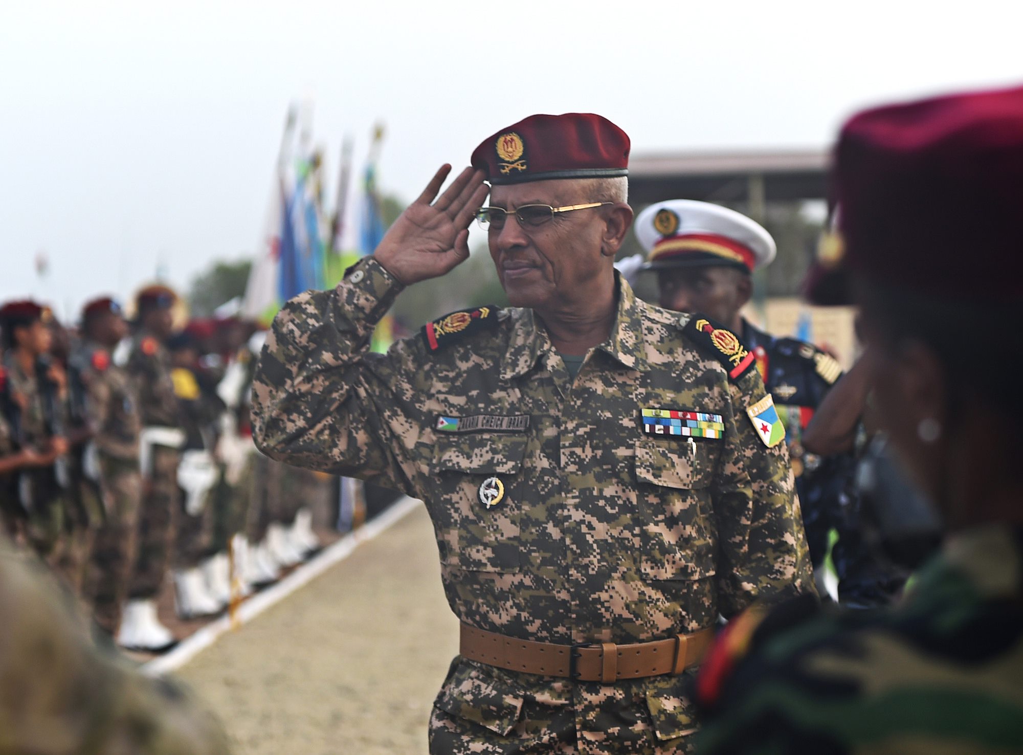 Gen. Zakaria Cheikh Ibrahim, Djiboutian Armed Forces (FAD) chief of defense, salutes his troops during the FAD’s 38th anniversary celebration at Camp Cheik Osman, Djibouti, June 6, 2015. Zakaria gained command in 2013 and is responsible for 6500 Djiboutian military personnel. (U.S. Air Force photo by Senior Airman Nesha Humes)