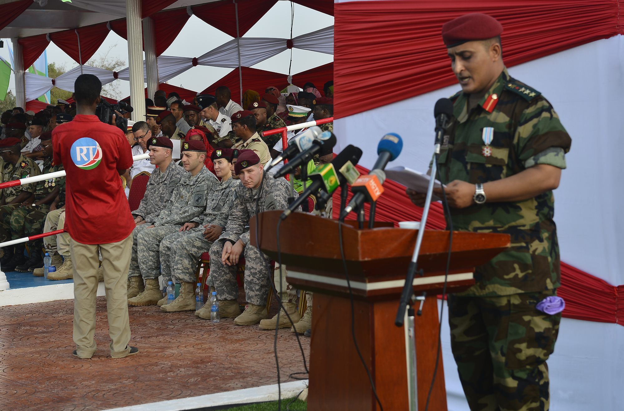 U.S. Army Soldiers assigned to Combined Joint Task Force-Horn of Africa, listen to a speaker during the Djiboutian Armed Forces’ (FAD) 38th anniversary celebration June 6, 2015 at Camp Cheik Osman, Djibouti. The FAD invited its partner nations to celebrate the creation of the FAD while observing the pride and professionalism of Djibouti’s service members. (U.S. Air Force photo by Senior Airman Nesha Humes)