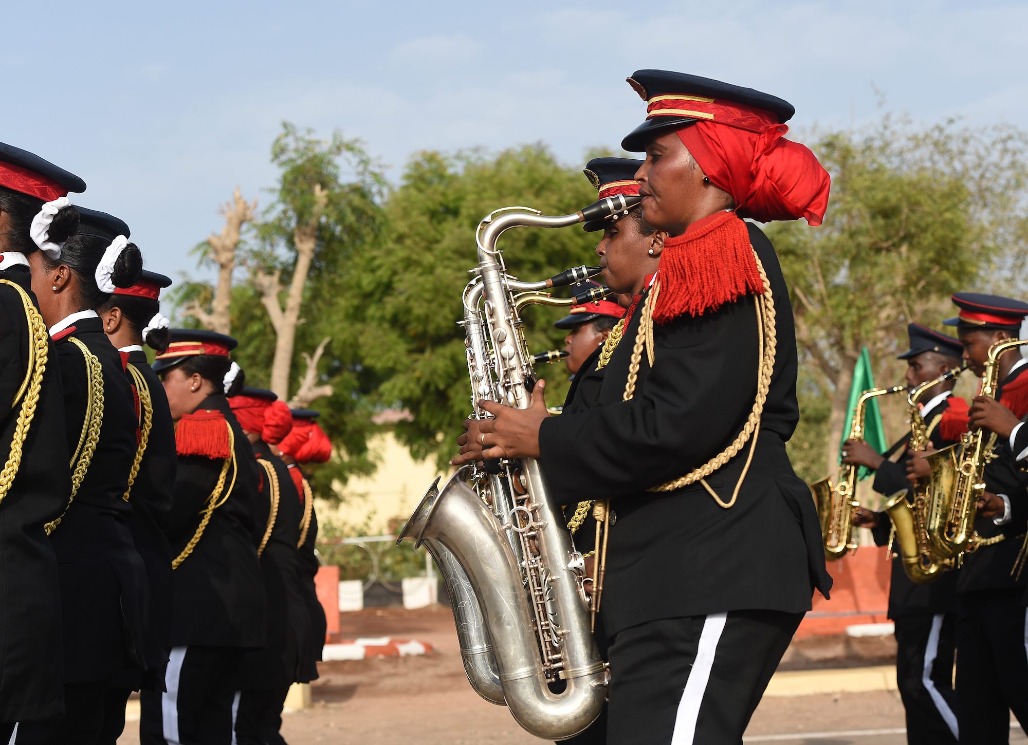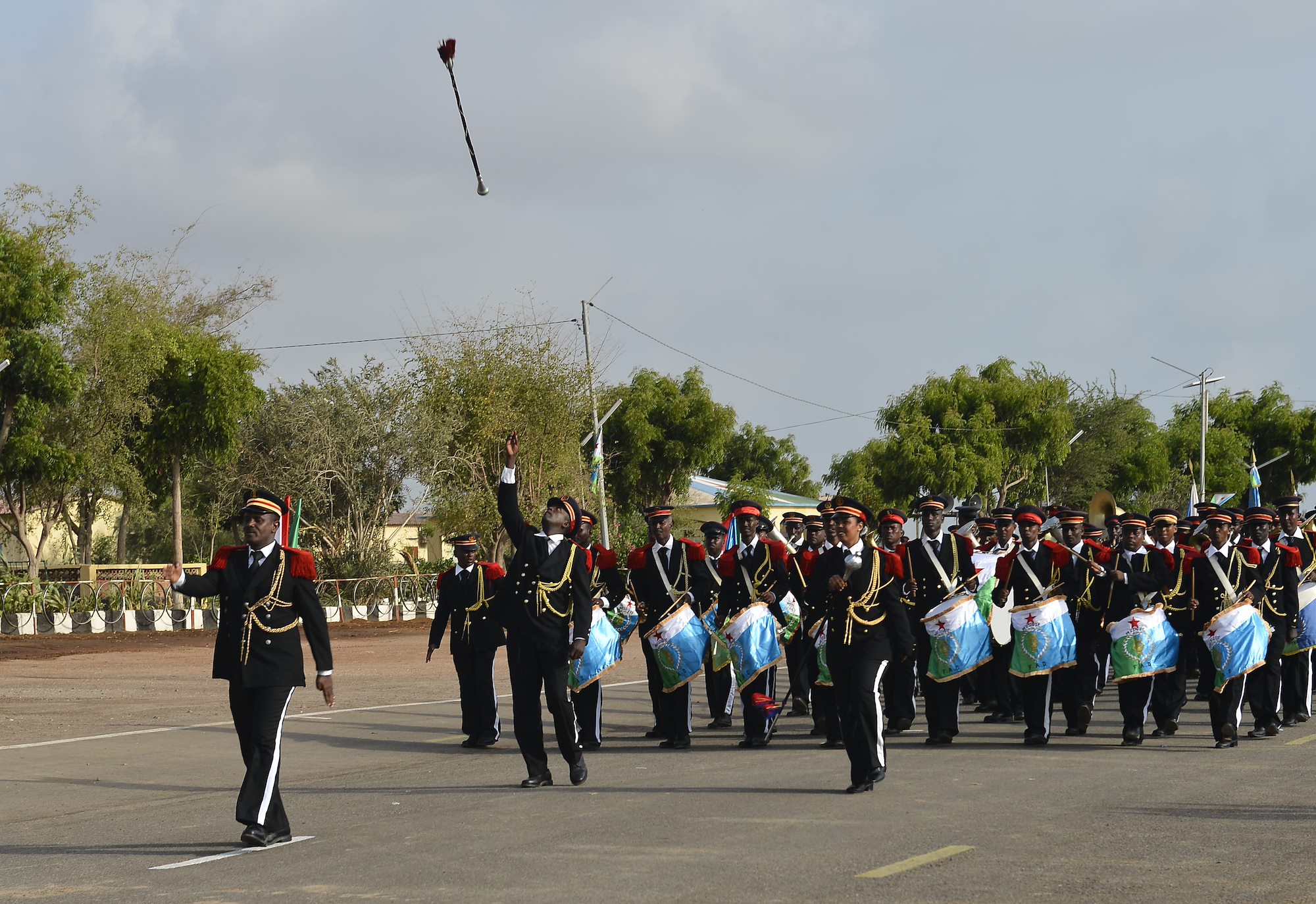 The Djiboutian Armed Forces (FAD) Marching Band performs during the Djiboutian Armed Forces’ (FAD) 38th anniversary celebration June 6, 2015 at Camp Cheik Osman, Djibouti. The FAD was created June, 6, 1977, 21 days before becoming an independent country. (U.S. Air Force photo by Senior Airman Nesha Humes)