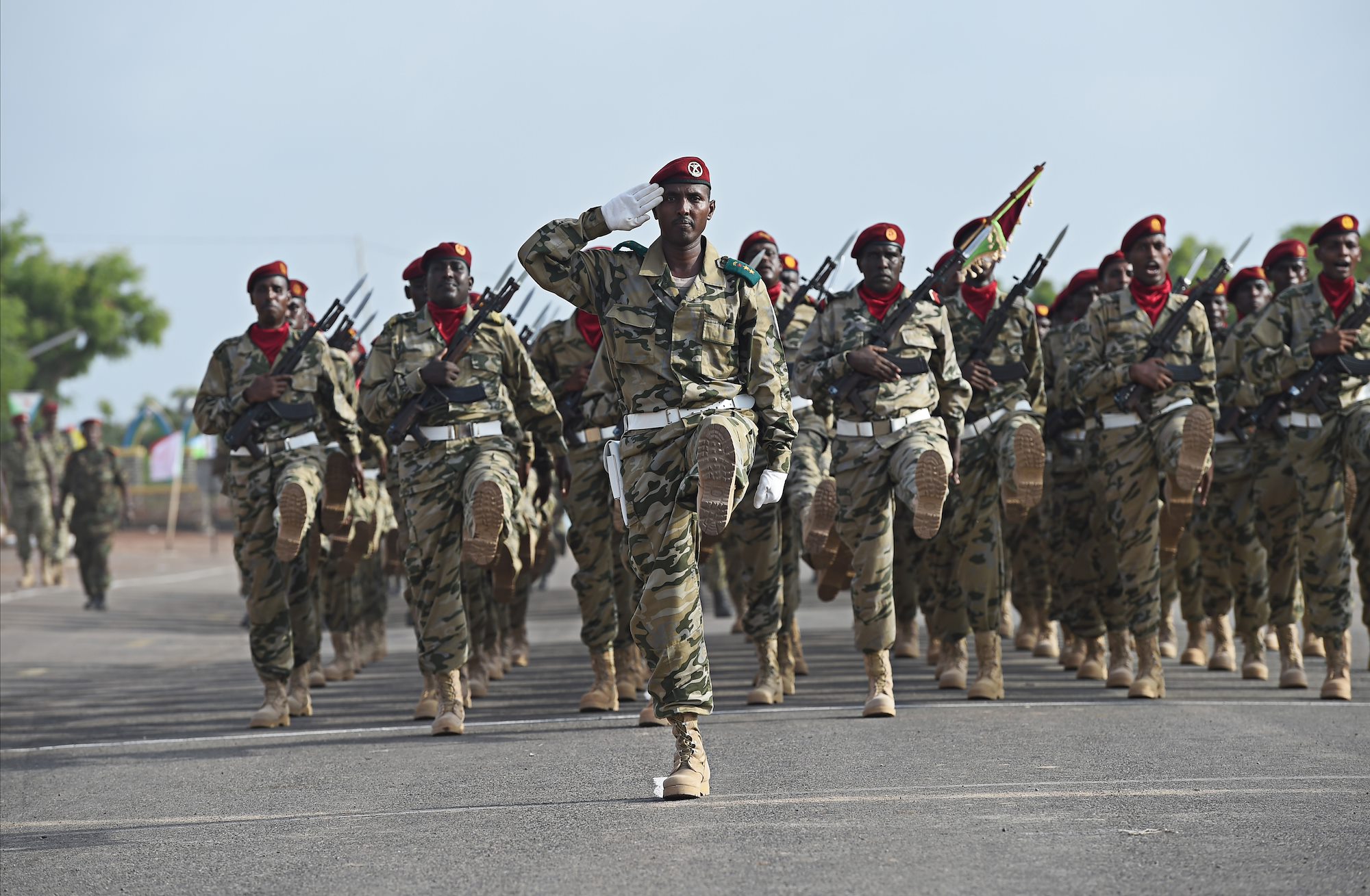 Djiboutian Army members march during the Djiboutian Armed Forces’ (FAD) 38th anniversary celebration June 6, 2015 at Camp Cheik Osman, Djibouti,. The FAD is comprised of 6500 Army, Air Force and Navy personnel. (U.S. Air Force photo by Senior Airman Nesha Humes)
