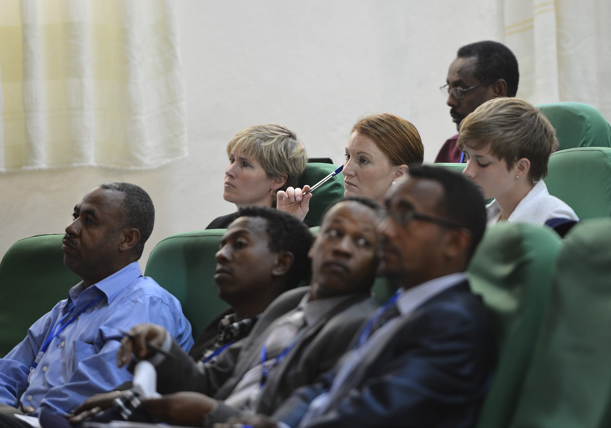 The U.S. Army 404th Civil Affairs Battalion Veterinary Cell Team, assigned to Combined Joint Task Force- Horn of Africa, listen to scientific paper presentations at the Third International Veterinary Education Conference at Haramaya University in Dire Dawa, Ethiopia, June 18, 2015. The conference brought together more than 100 East African policy makers, professors, government officials, students and international partners. (U.S. Air Force photo by. Senior Airman Nesha Humes)