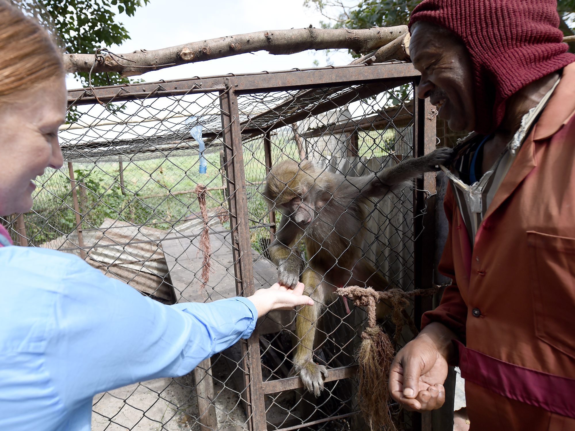 U.S. Army Capt. Jodi Collins, left, 404th Civil Affairs Battalion veterinarian, assigned to Combined Joint Task Force- Horn of Africa, feeds a monkey at the Haramaya University Zoo in Dire Dawa, Ethiopia, June 19, 2015. The team attended the Third International Veterinary Education Conference hosted by the HU College of Veterinary Medicine. (U.S. Air Force photo by. Senior Airman Nesha Humes)