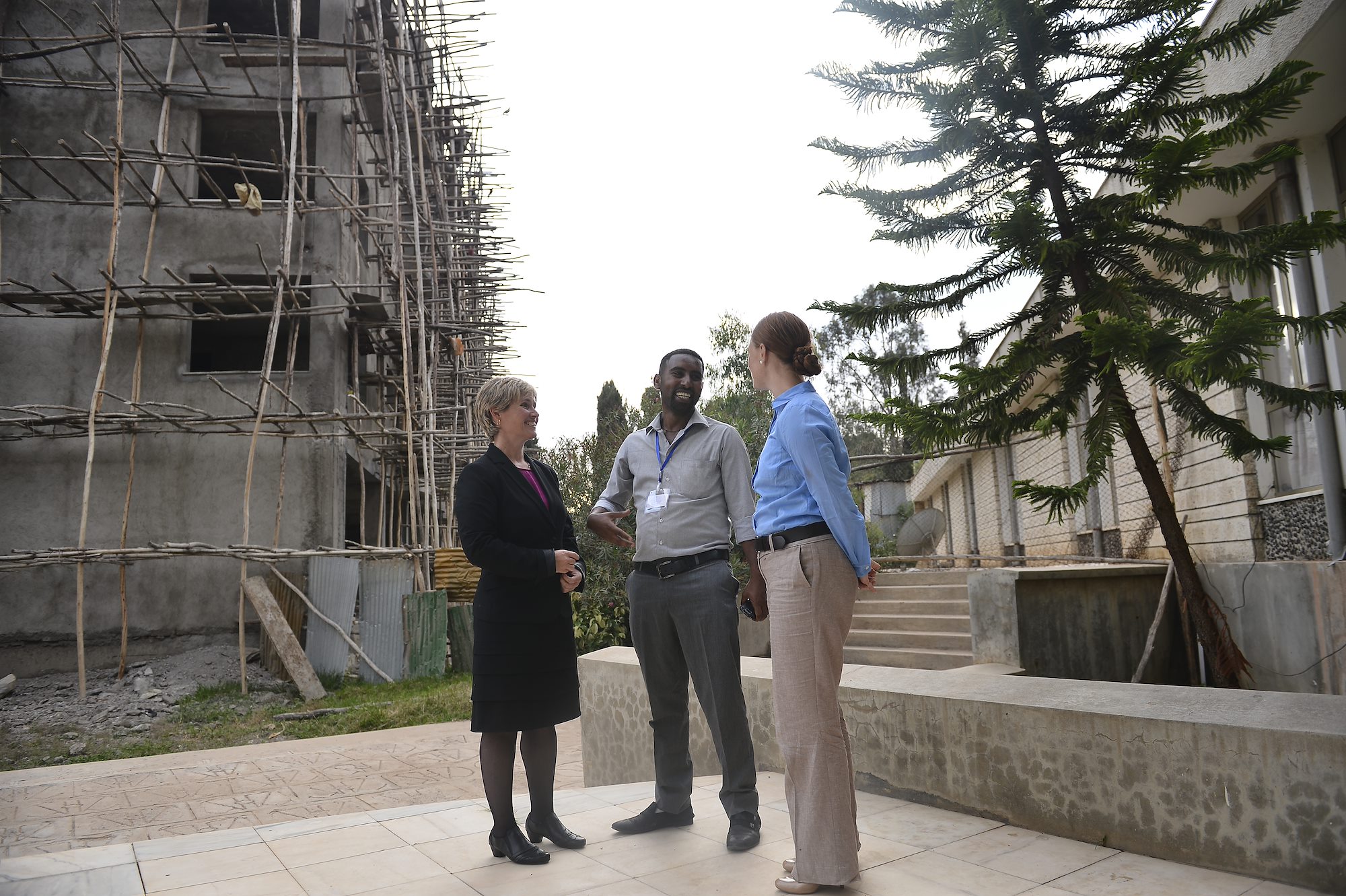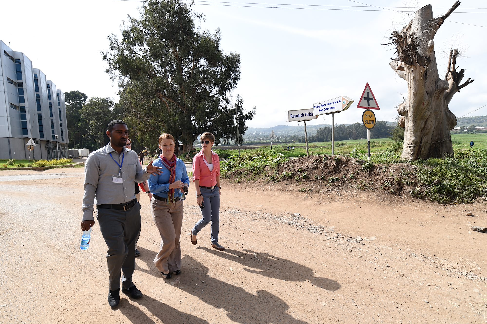 Hailemariam Kefyalew, left, Haramaya University College of Veterinary Medicine assistant professor gives a campus tour to U.S. Army 404th Civil Affairs Battalion Capt. Jodi Collins, veterinarian and Sgt. Stephanie Taylor, left, veterinary technician, in Dire Dawa, Ethiopia, June 19, 2015. The CA team, assigned to Combined Joint Task Force- Horn of Africa, was invited to attend the Third International Veterinary Education Conference. Established in 2003, CVM houses dairy, beef, poultry, swine, sheep and goat farms for demonstrations and research purposes. (U.S. Air Force photo by. Senior Airman Nesha Humes)