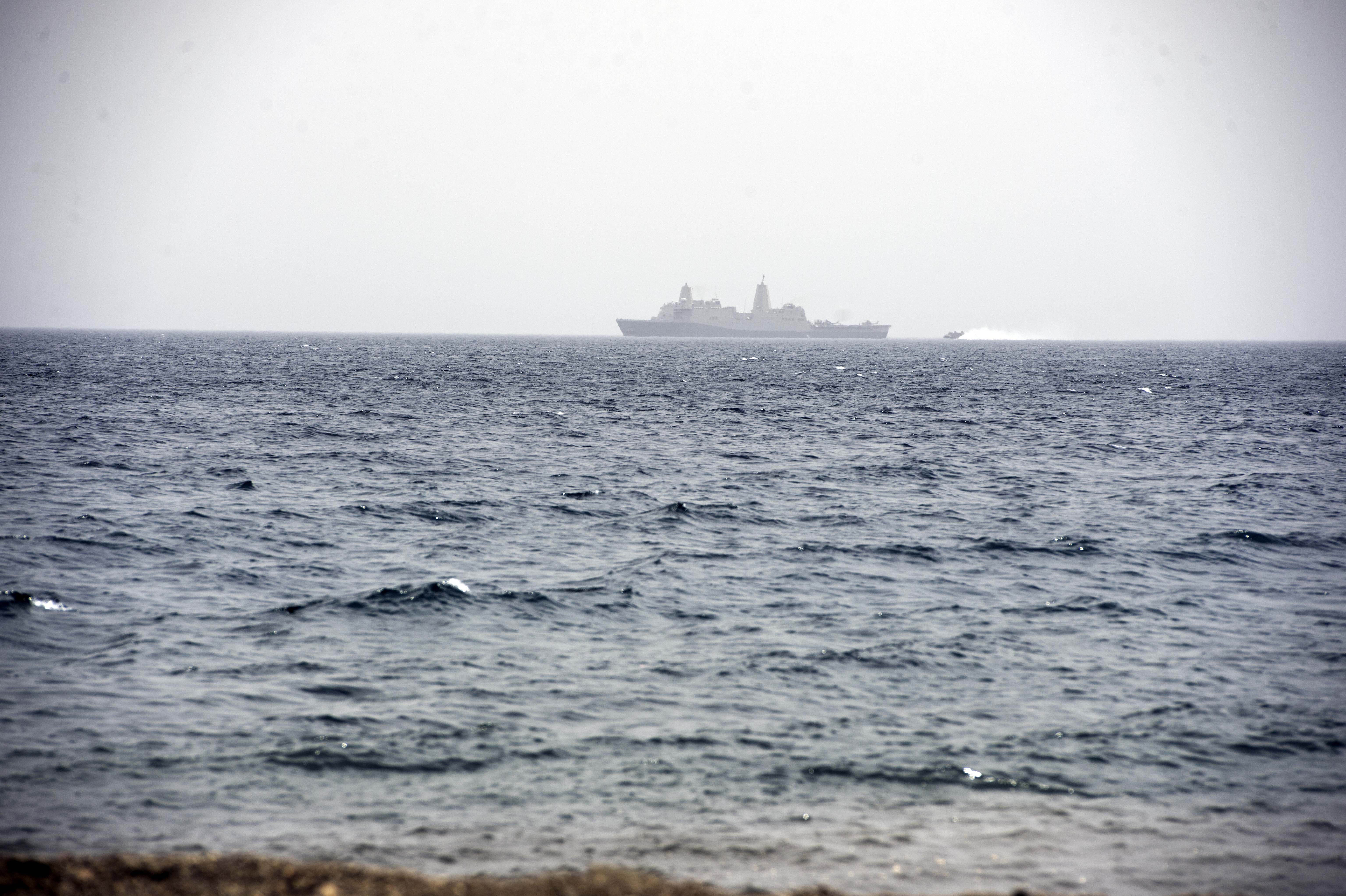 The San Antonio-class amphibious transport dock ship USS Anchorage (LPD-23) patrols the Gulf of Tadjoura as a Landing Craft Air Cushion (LCAC) approaches its stern during a two week sustainment exercise for the 15th Marine Expeditionary Unit in Djibouti, Africa, July 20, 2015. USS Anchorage, also known as an amphibious warfare ship, and is designed to transport and land elements of a landing force for expeditionary warfare missions. (U.S. Air Force photo by Staff Sgt. Nathan Maysonet)