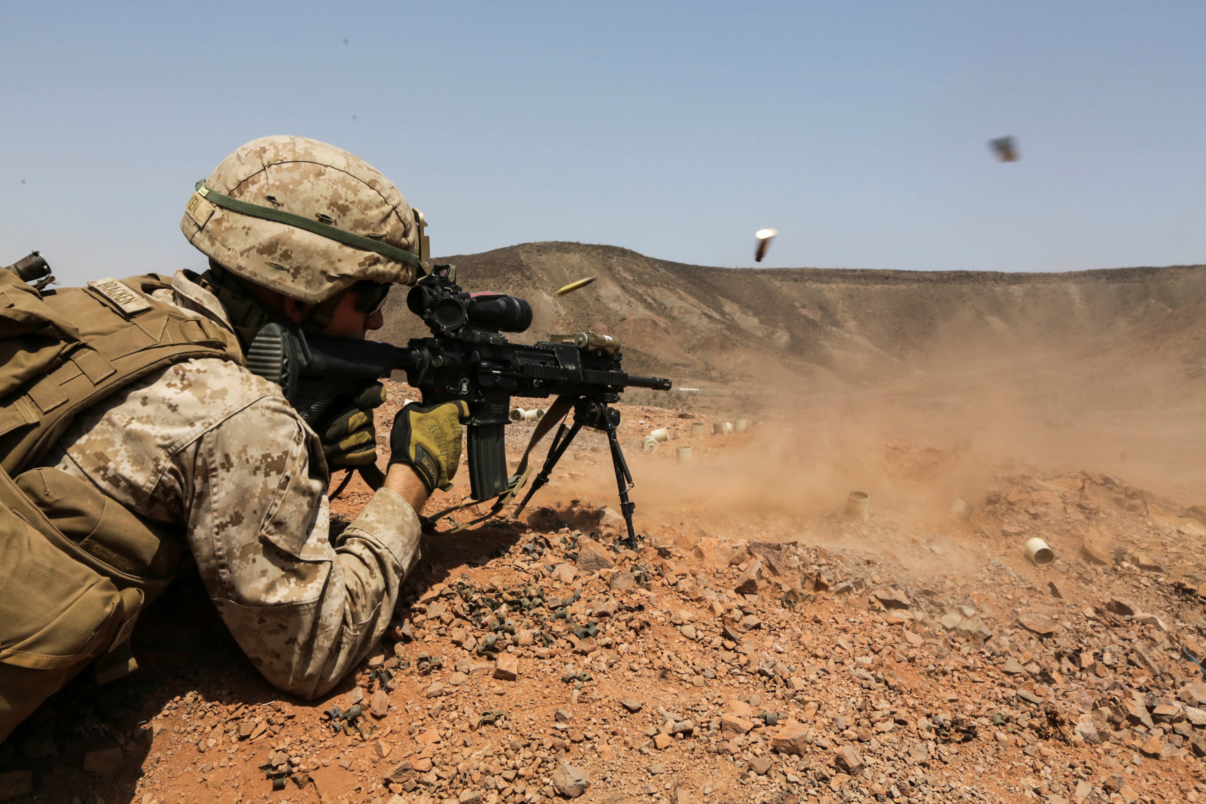 ARTA BEACH, Djibouti (July 29, 2015) A U.S. Marine with Light Armored Reconnaissance Detachment, Battalion Landing Team 3rd Battalion, 1st Marine Regiment, 15th Marine Expeditionary Unit, engages his target in a fire-and-maneuver exercise during sustainment training. Elements of the 15th MEU are ashore in Djibouti for sustainment training to maintain and enhance the skills they developed during their pre-deployment training period. The 15th MEU is currently deployed in support of maritime security operations and theater security cooperation efforts in the U.S. 5th and 6th Fleet areas of operation. (U.S. Marine Corps photo by Sgt. Steve H. Lopez/Released)