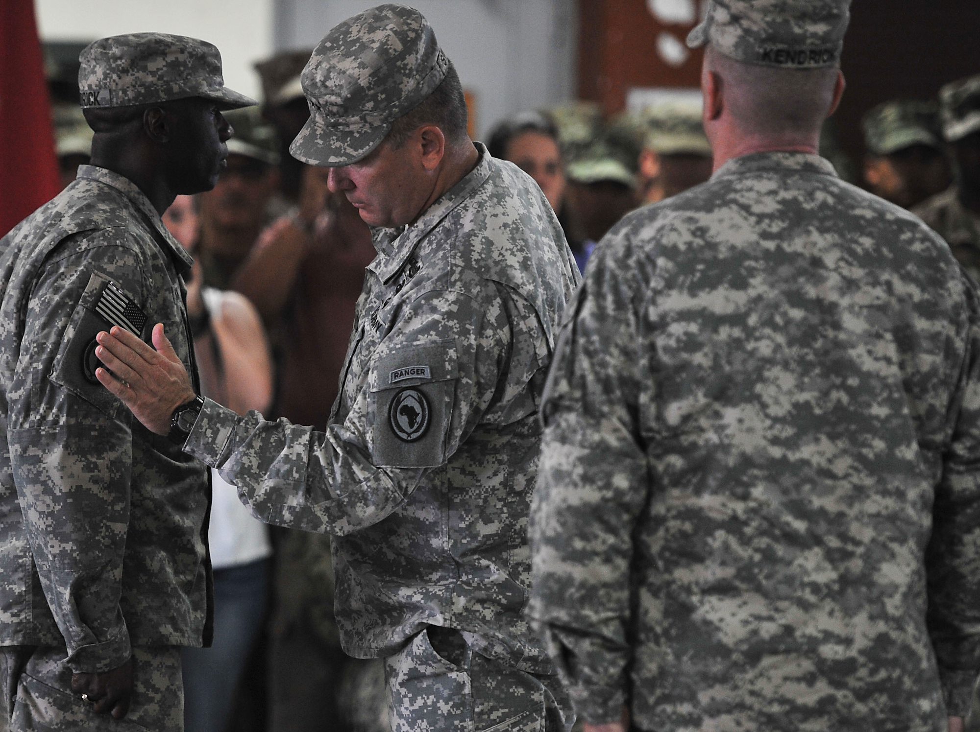 Maj. Martin Stufflebeam, Combined Joint Task Force-Horn of Africa CJ-1 deputy director, places a combat patch on one of more than 150 soldiers awarded the patch during a ceremony held at Camp Lemonnier, Djibouti, Nov. 28, 2015. The soldiers assigned to CJTF-HOA are now authorized to wear the U.S. Africa Command patch for the duration of their careers. (U.S. Air Force photo by Tech. Sgt. Dan DeCook)