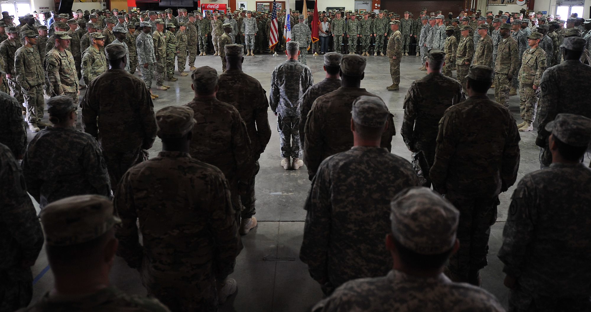 A soldier from Combined Joint Task Force-Horn of Africa stands in formation before the start of a patching ceremony at Camp Lemonnier, Djibouti, Nov. 28, 2015. The patching ceremony is a time-honored tradition with roots dating back to World War I. (U.S. Air Force photo by Tech. Sgt. Dan DeCook)