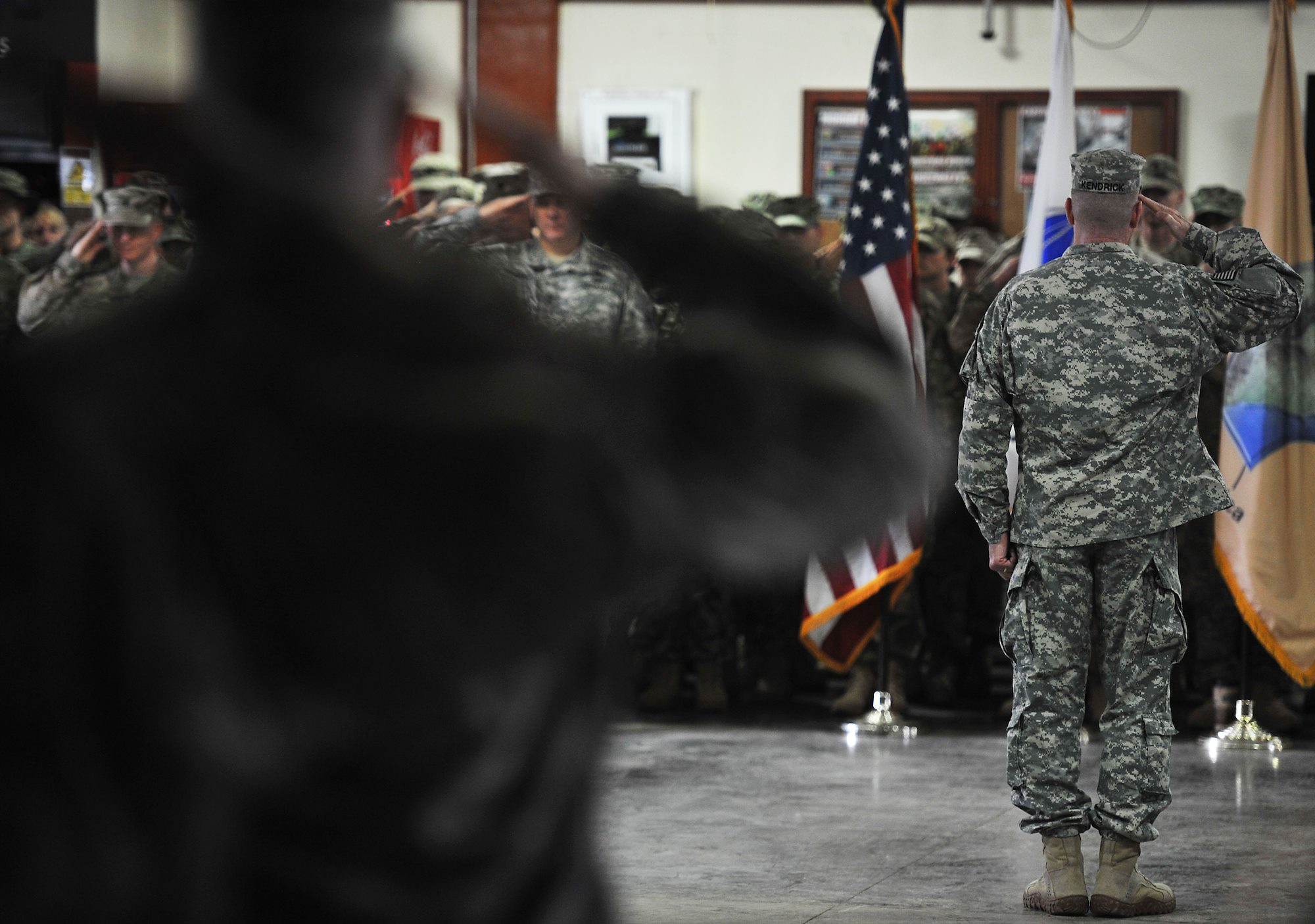 Col. Kelly Kendrick, Combined Joint Task Force-Horn of Africa CJ3-5-7 director, salutes Maj. Gen. Mark Stammer, CJTF-HOA commanding general, beginning a patching ceremony for soldiers at Camp Lemonnier, Djibouti, Nov. 28, 2015. The patching ceremony is a time-honored tradition with roots dating back to World War I. (U.S. Air Force photo by Tech. Sgt. Dan DeCook)