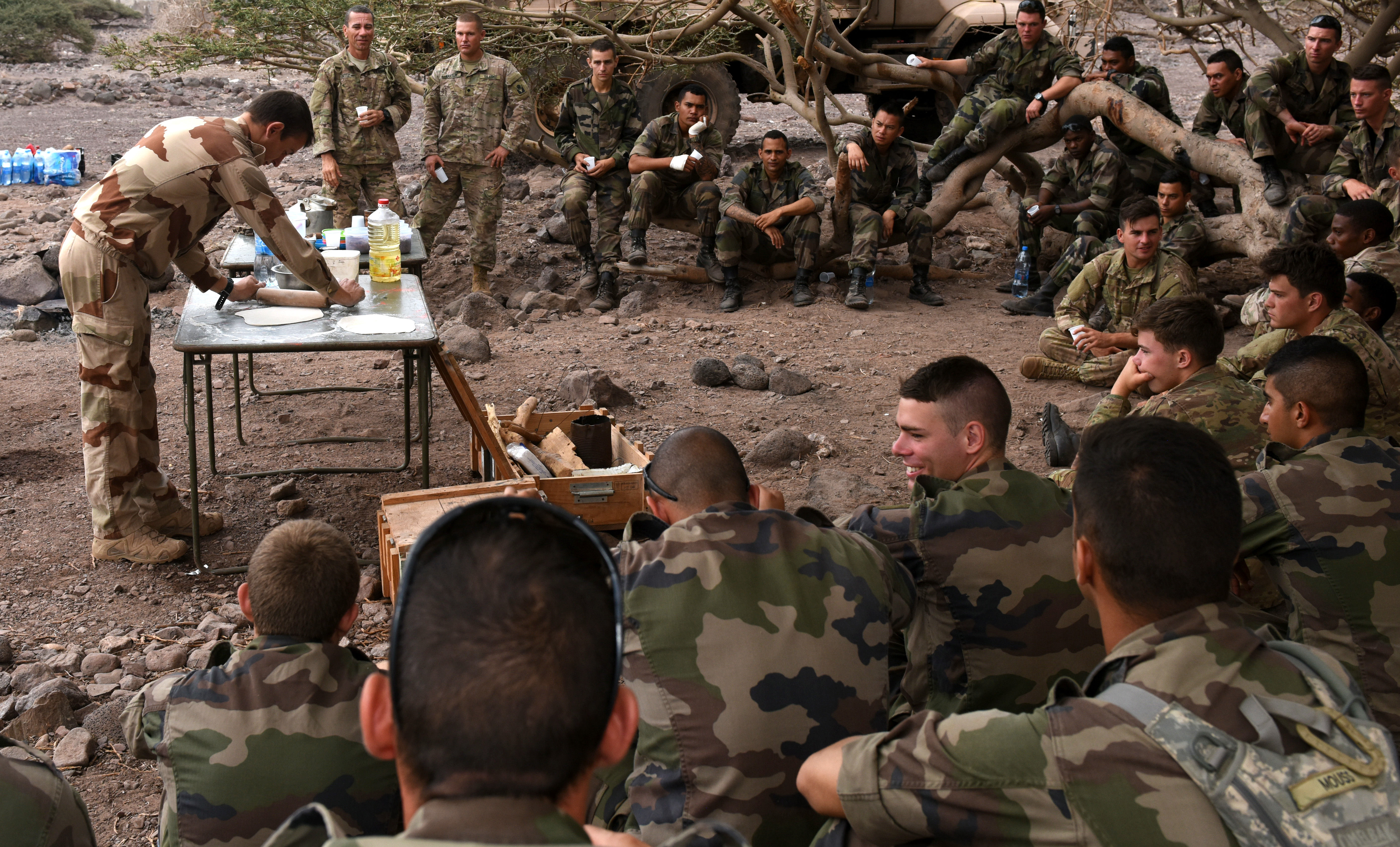 U.S. and French soldiers make flatbread during a French Desert Survival Course near Arta Beach, Djibouti, Jan. 13, 2016. Using techniques that can be used in survival situations, students worked together to make a meal for the whole group. (U.S. Air Force photo by Staff Sgt. Kate Thornton)
