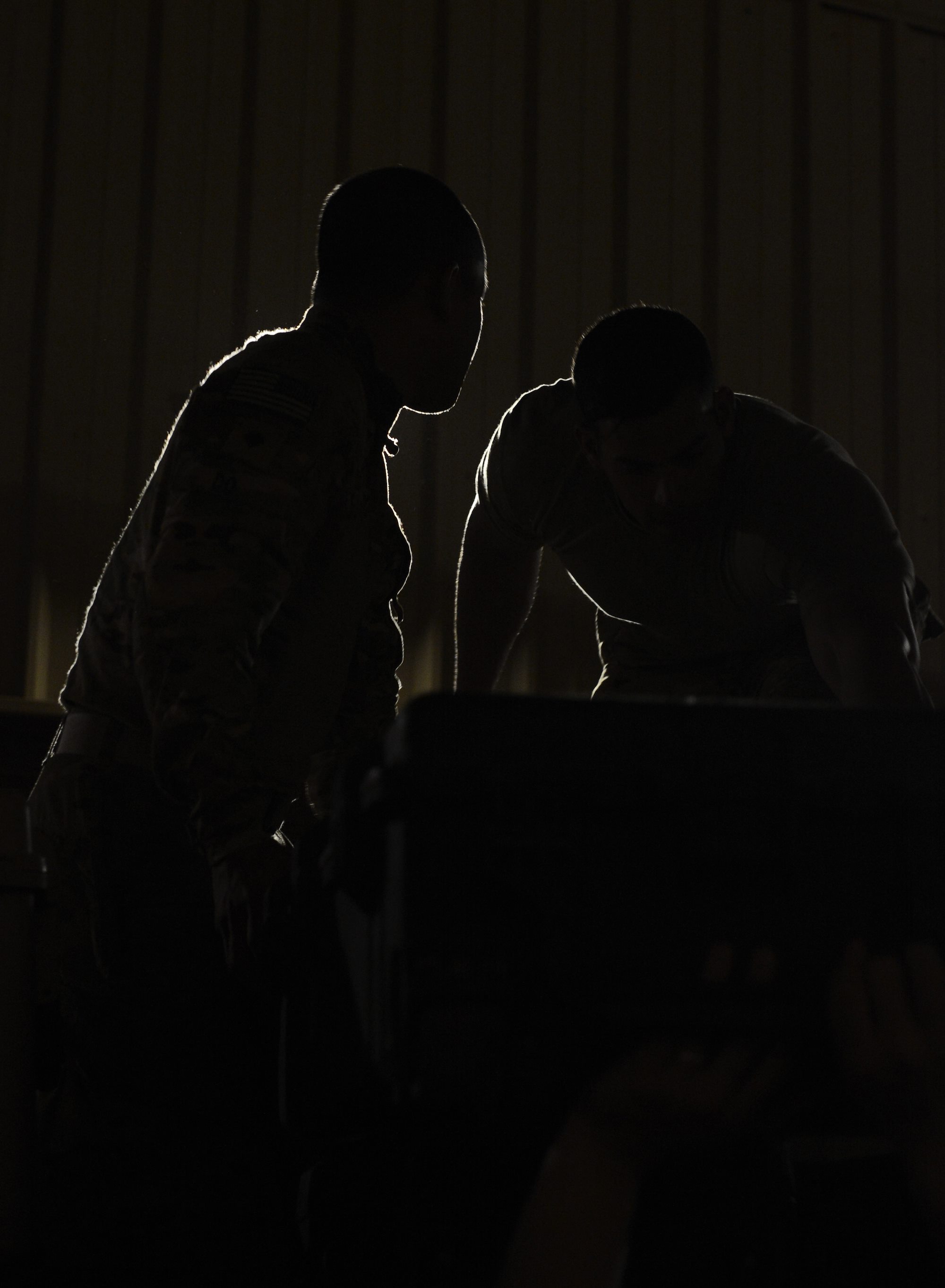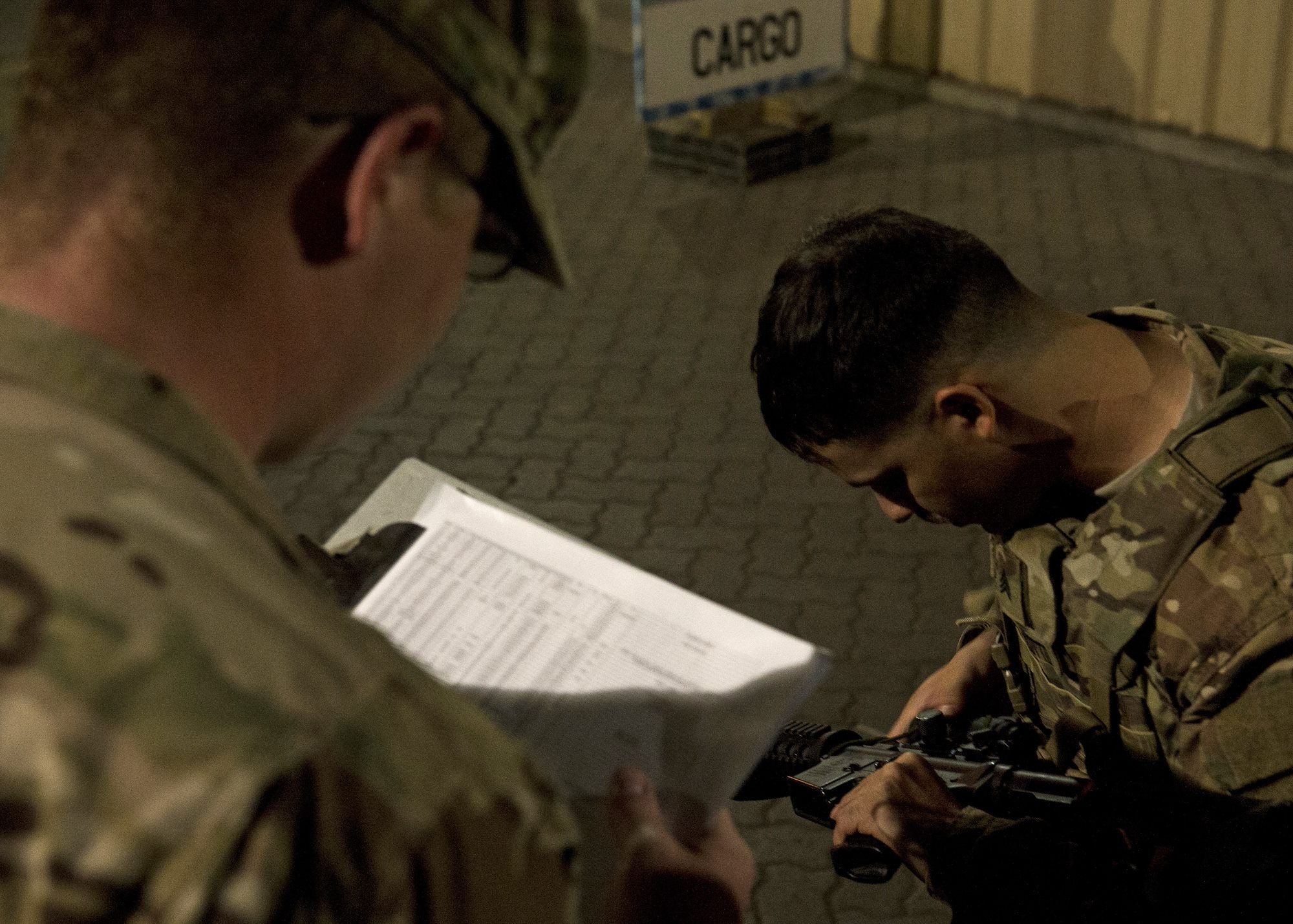 Soldiers from Bravo Company, 3rd Battalion, 15th Infantry Regiment, verify equipment information Feb. 13, 2016, at Camp Lemonnier, Djibouti. Members of Bravo Company participated in a two-part validation exercise that consisted of a rapid mobilization scenario from the camp, which lead to the company convoying to and providing simulated security for the U.S. Embassy in Djibouti. (U.S. Air Force photo by Senior Airman Peter Thompson)