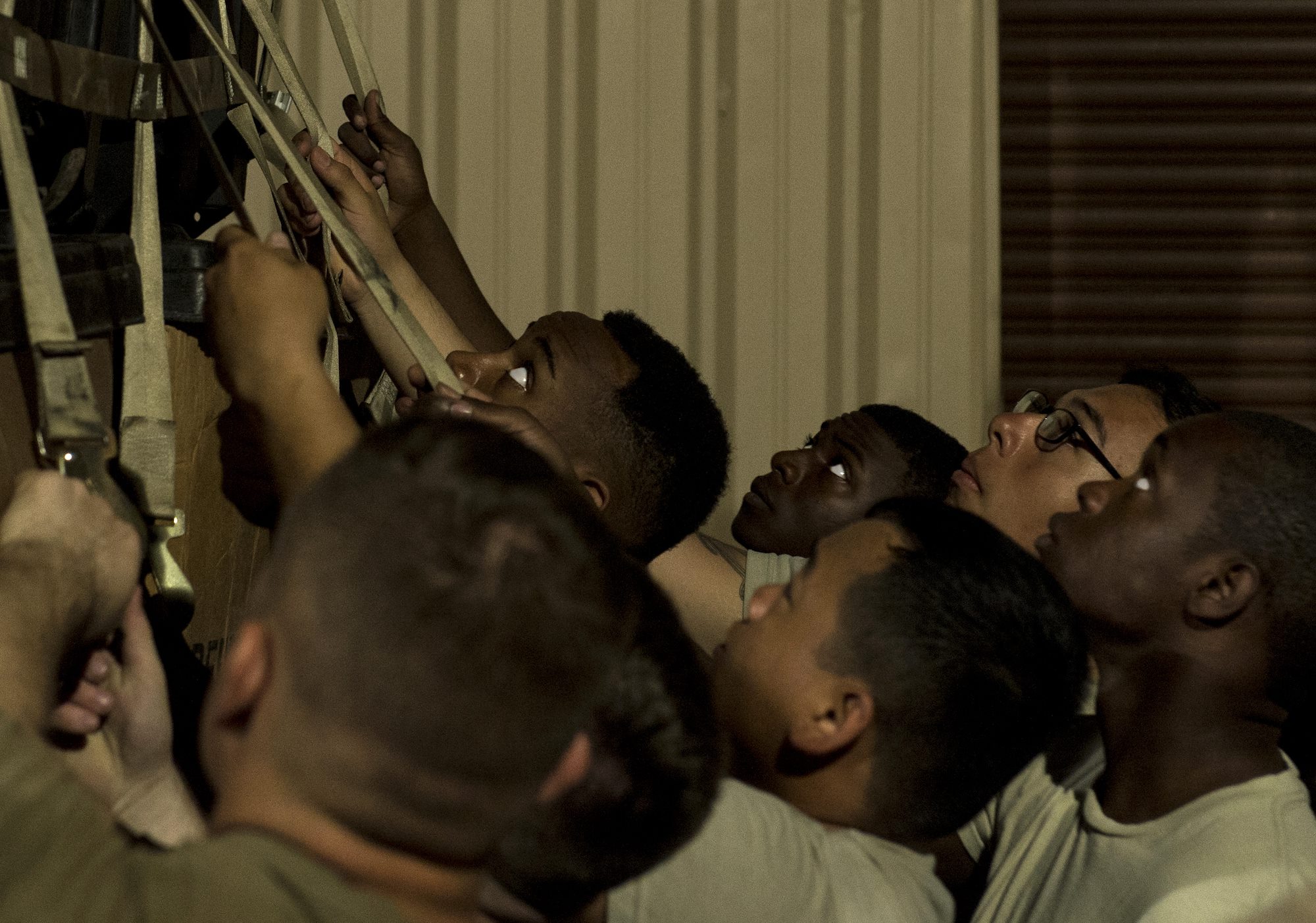 Soldiers from Bravo Company, 3rd Battalion, 15th Infantry Regiment, listen for the order to pull while securing equipment to a pallet Feb. 13, 2016, at Camp Lemonnier, Djibouti. The East Africa Response Force serves as a part of U.S. Africa Command’s crisis response capability, and is tasked with responding to emergency situations at U.S. Embassies in the East African region or in countries around the CJTF-HOA area of responsibility. (U.S. Air Force photo by Senior Airman Peter Thompson)