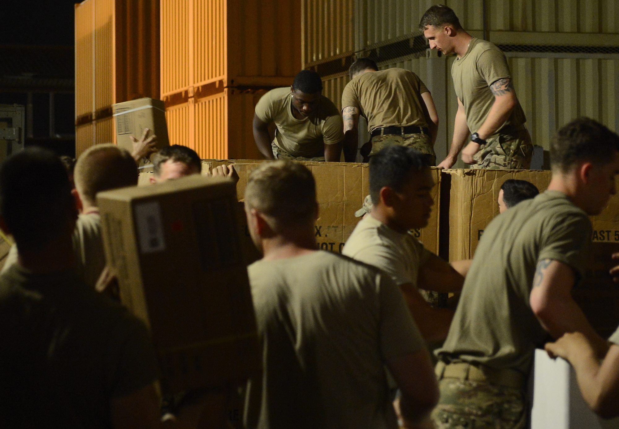 Soldiers from Bravo Company, 3rd Battalion, 15th Infantry Regiment, load pallets with water and meals ready-to-eat Feb. 13, 2016, at Camp Lemonnier, Djibouti. After being recalled in the early hours of the morning to validate the East Africa Response Force’s rapid response ability, EARF members gathered and immediately began by prepping personal gear and equipment. Shortly after, teams began building pallets with all the necessities for self-sustainment and mission accomplishment. (U.S. Air Force photo by Senior Airman Peter Thompson)
