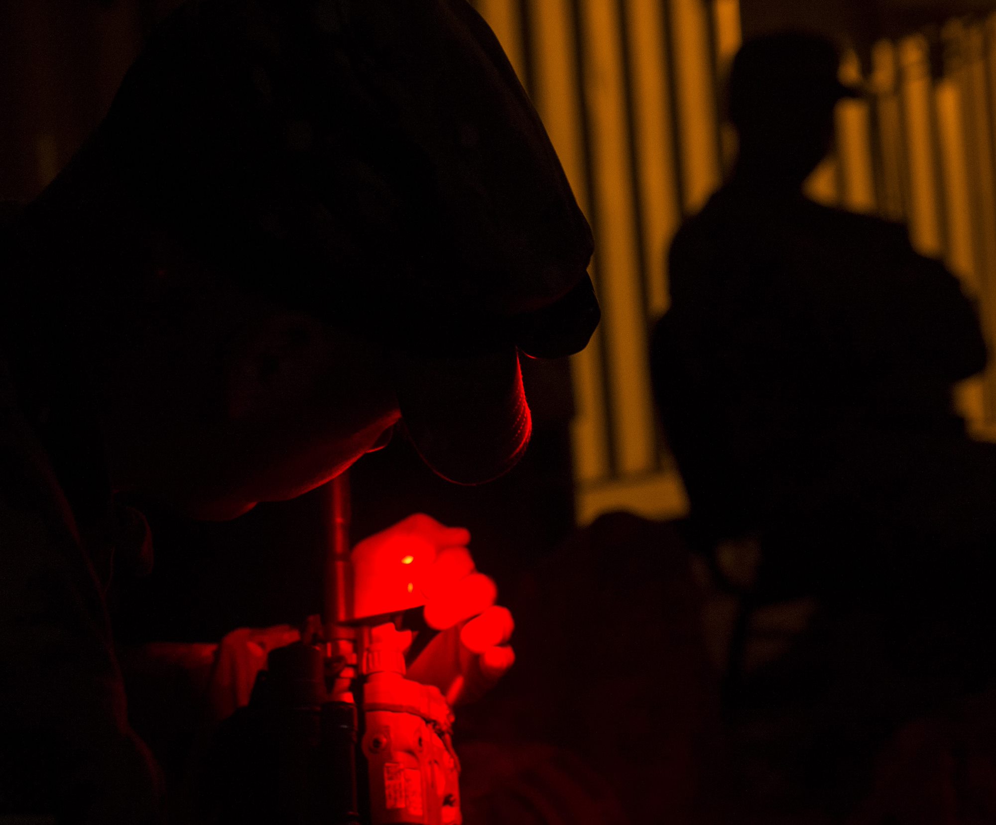 A U.S. Army Soldier from Bravo Company, 3rd Battalion, 15th Infantry Regiment, verifies his laser is properly functioning Feb. 13, 2016, at Camp Lemonnier, Djibouti. The East Africa Response Force serves as a part of U.S. Africa Command’s crisis response capability, and is tasked with responding to emergency situations at U.S. Embassies in the East African region or in countries around the CJTF-HOA area of responsibility. (U.S. Air Force photo by Senior Airman Peter Thompson)
