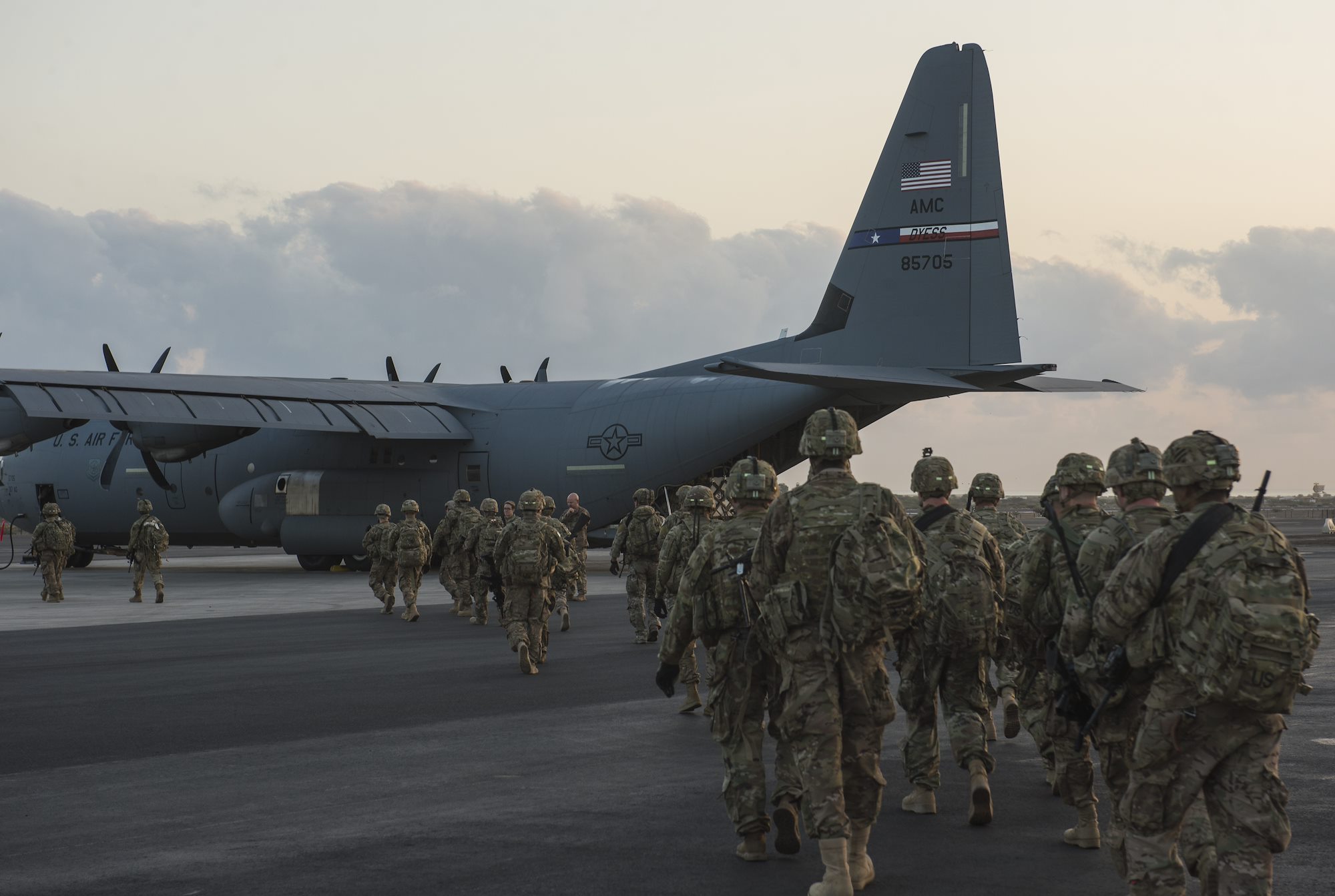 The pallets and dozens of infantrymen were loaded onto a C-130J Super Hercules from the 75th Expeditionary Airlift Squadron, deployed from Dyess Air Force Base, Texas. Within minutes of being fully loaded, the aircraft was preparing for takeoff.