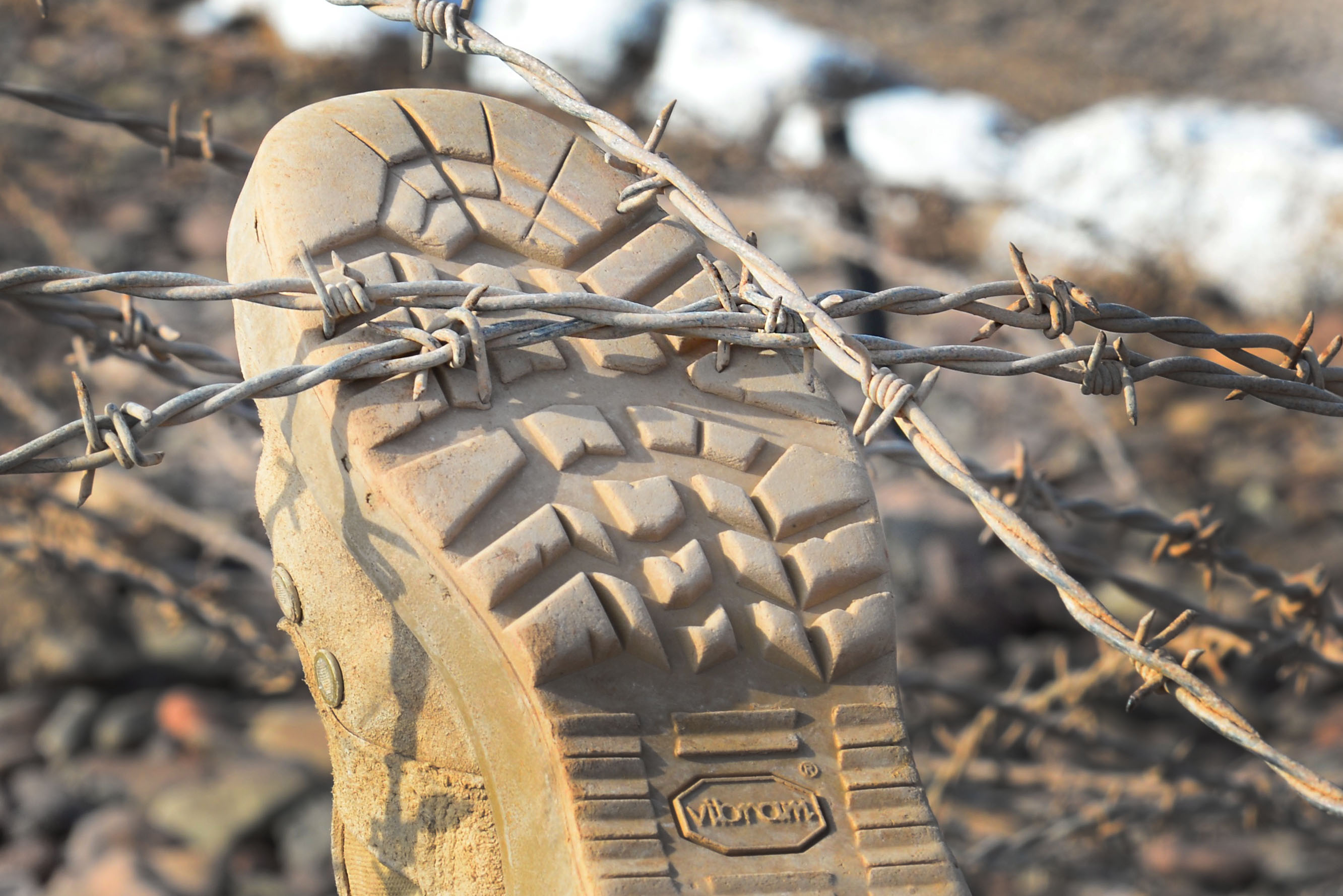 A U.S. Army soldier lifts barbed wire with his boot during the French Desert Survival Course, May 6, 2016, at Arta Plage, Djibouti. The team of 10 soldiers were able to safely maneuver through a barbed wire field by lifting the barbs with their feet allowing the next soldier to move past. (U.S. Air Force photo by Senior Airman Benjamin Raughton/Released)