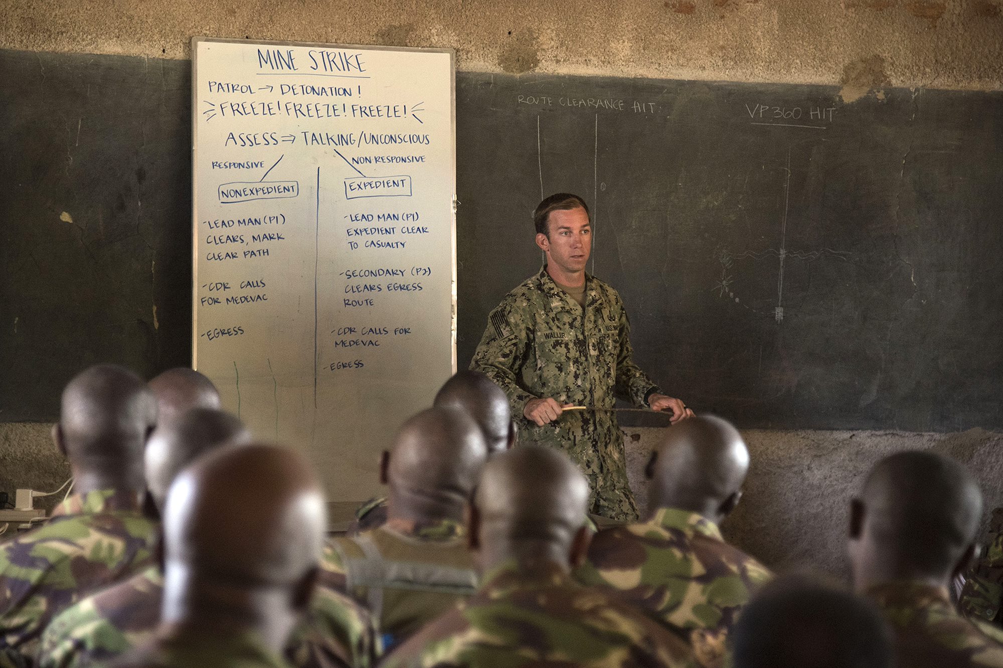 KENYA- U.S. Navy Chief Petty Officer Ryan Waller, Task Force Sparta explosive ordnance disposal technician and Deliberate Kindle instructor, explains the final portion of the tactical combat medical training to Kenyan Defense Force combat engineers during Deliberate Kindle 2016, Sept. 15, at a Kenyan training facility. The medical training was just one portion of the four-week course designed to give Humanitarian Mine Action training to course attendees, so as to prepare them for future deployments with the African Union Mission in Somalia. (U.S. Air Force photo by Staff Sgt. Tiffany DeNault)