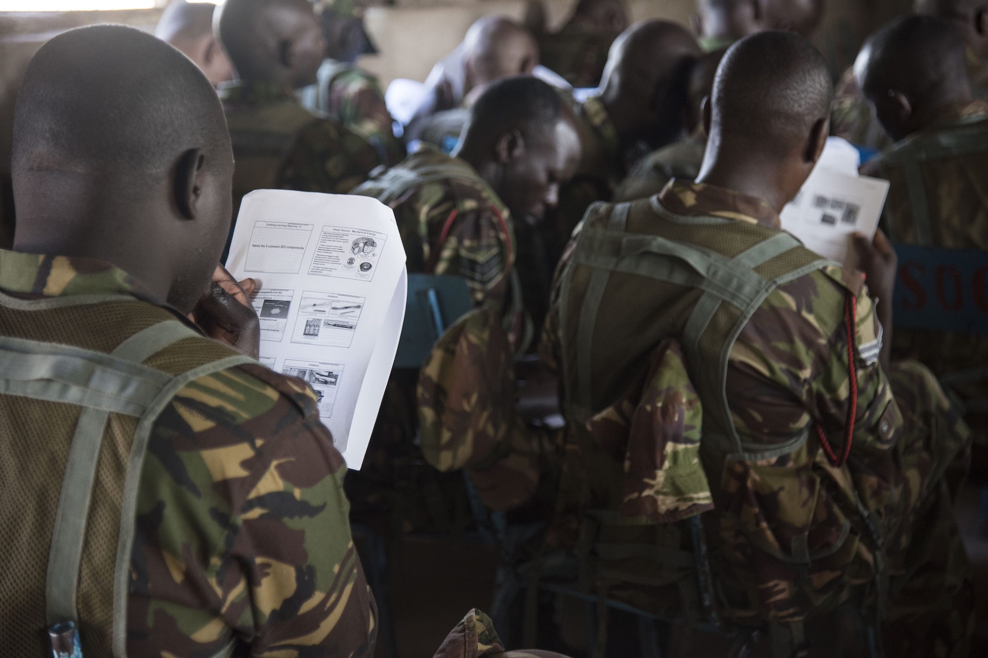 KENYA- Combat engineers with the Kenyan Defense Force review improvised explosive device (IED) study guides during Deliberate Kindle 2016, a four-week Humanitarian Mine Action course taught by Task Force Sparta, Sept. 13, at a Kenyan training center. U.S. Navy explosive ordnance disposal technicians and a dive independent duty corpsman provided training in countering improvised explosive devices and unexploded ordnance, train-the-trainer, and tactical combat medical care training to approximately 53 KDF soldiers and officers in preparation for the KDF’s deployment with the African Union Mission in Somalia. (U.S. Air Force photo by Staff Sgt. Tiffany DeNault)